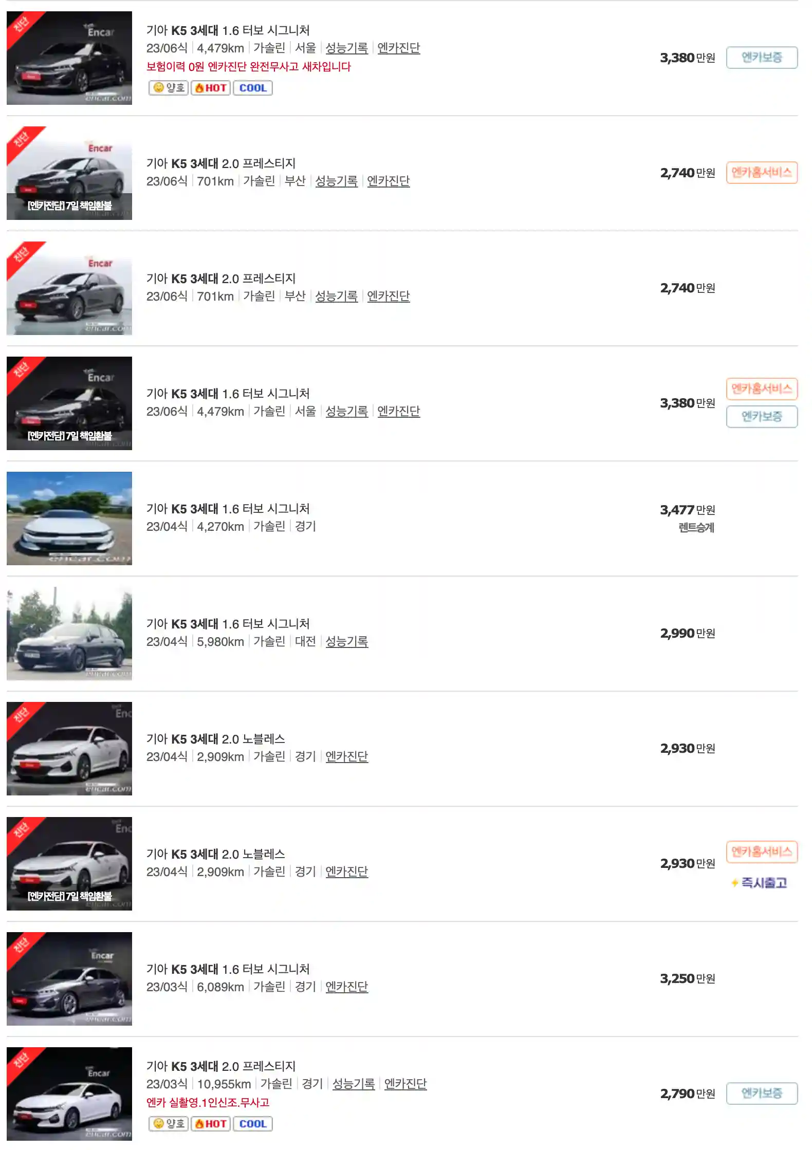 2023년 10월 기아 K5 중고차 시세에 대해 알려드립니다. 시세표 기준은 중고차 거래가 가장 많이 일어나는 엔카 중고차 플랫폼을 참고했습니다.