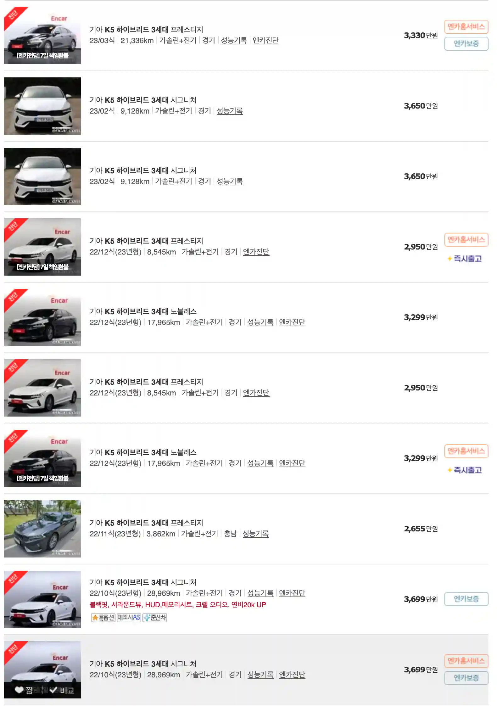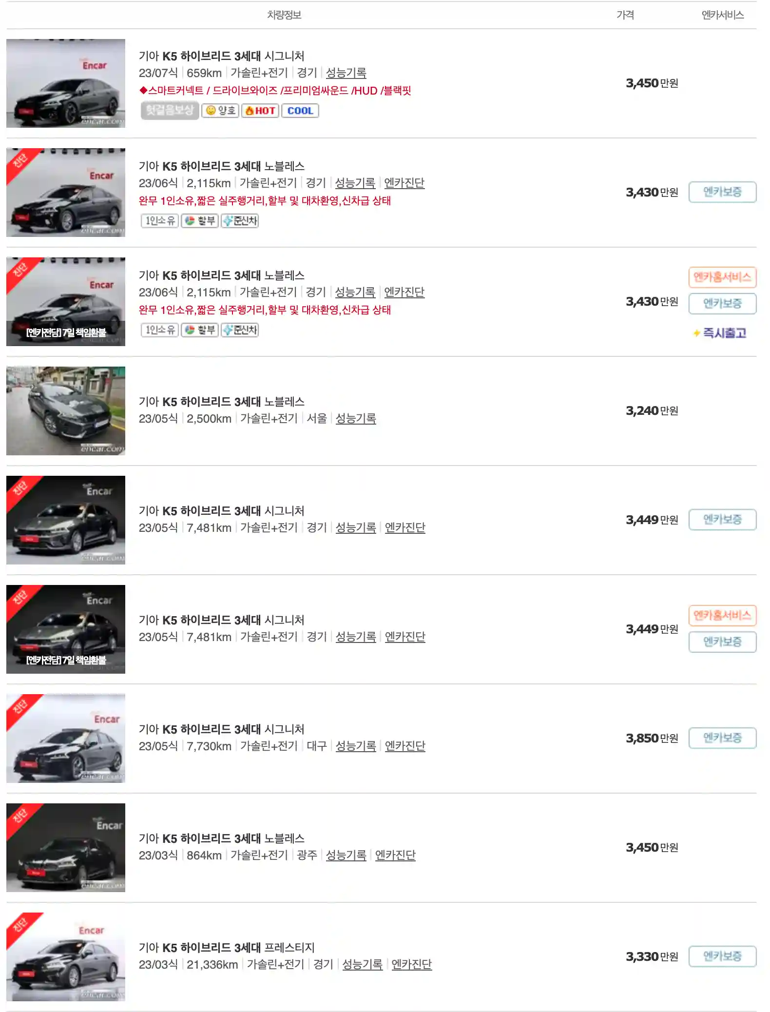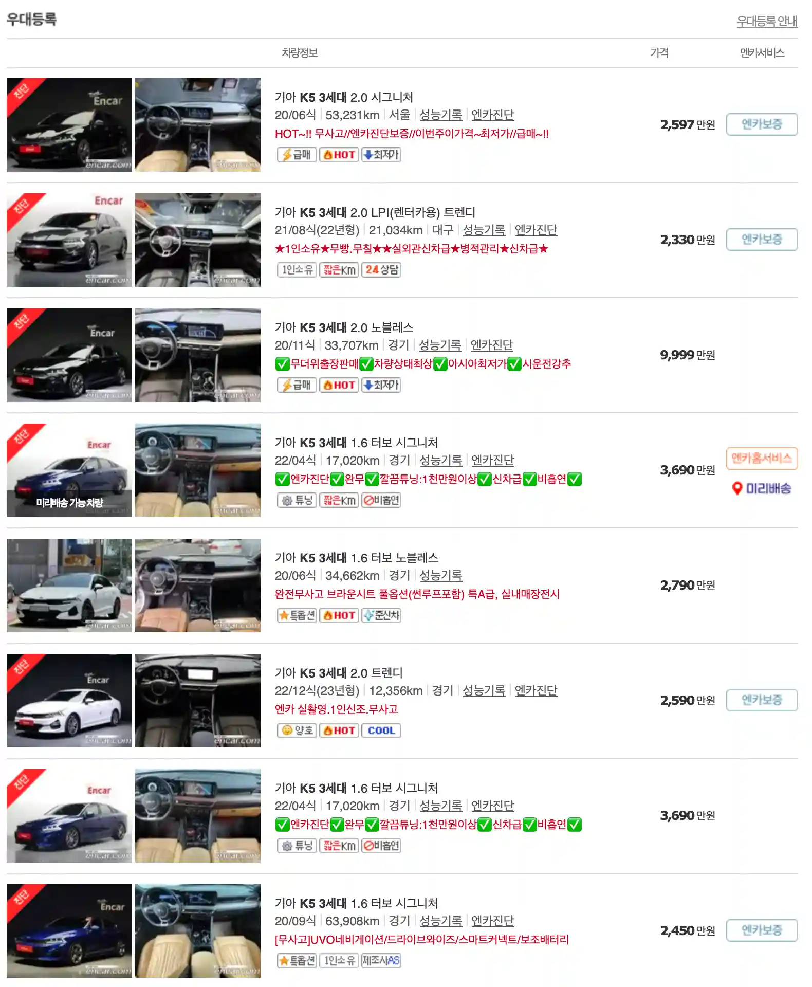 K5 중고차 가격을 모델별로 우대등록된 대표매물과 주행거리가 짧은 순으로 정렬했습니다. K5 신차 가격과 중고차 가격을 비교해보시고 연식, 무사고 여부, 선택 옵션 등 꼼꼼하게 확인해보시고 알아보시기 바랍니다. 인기가 많은 차종과 모델은 거래가 빠르게 이루어지기 때문에 엔카 홈페이지에 들어가셔서 실시간 거래 현황도 참고하시기 바랍니다.