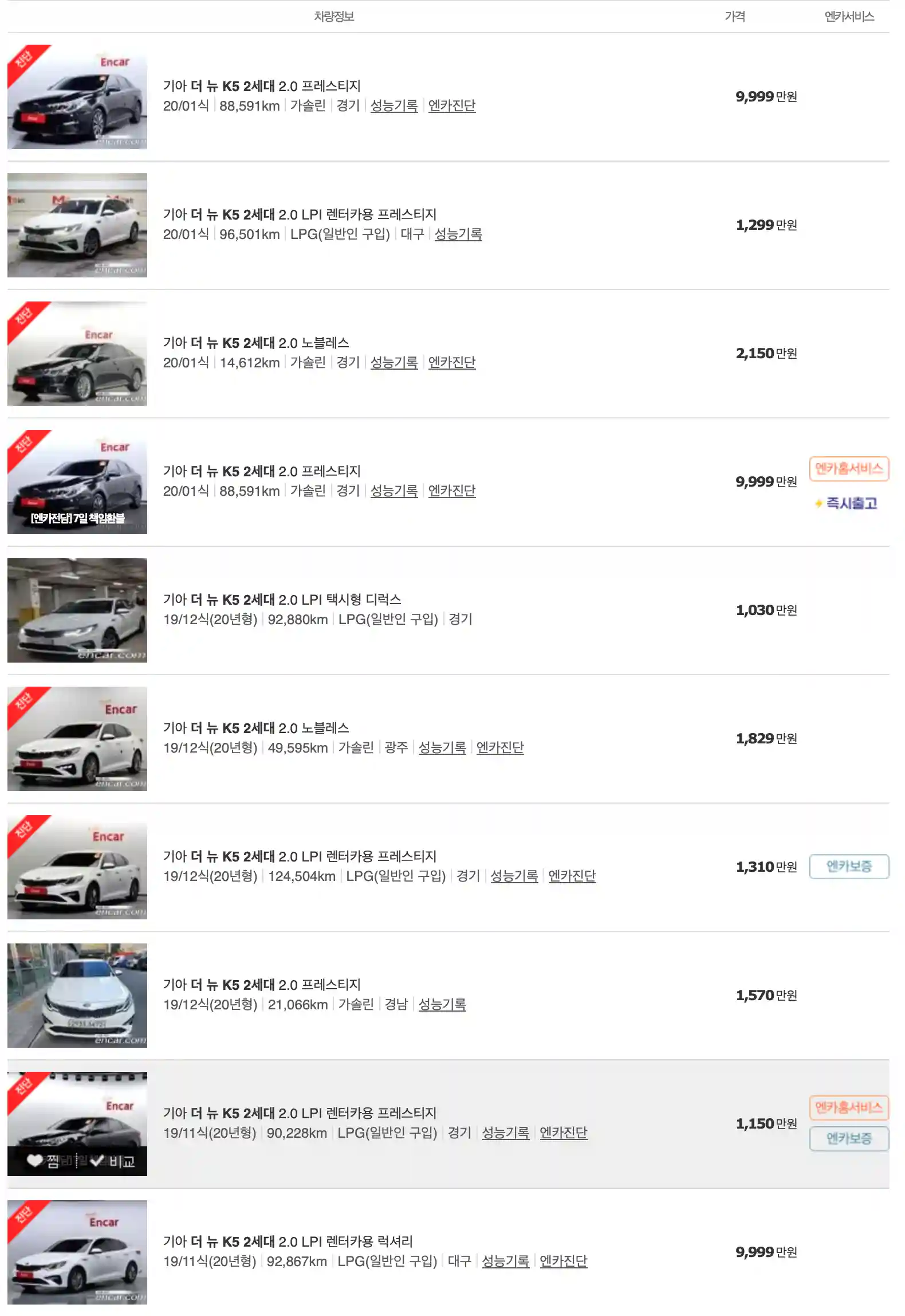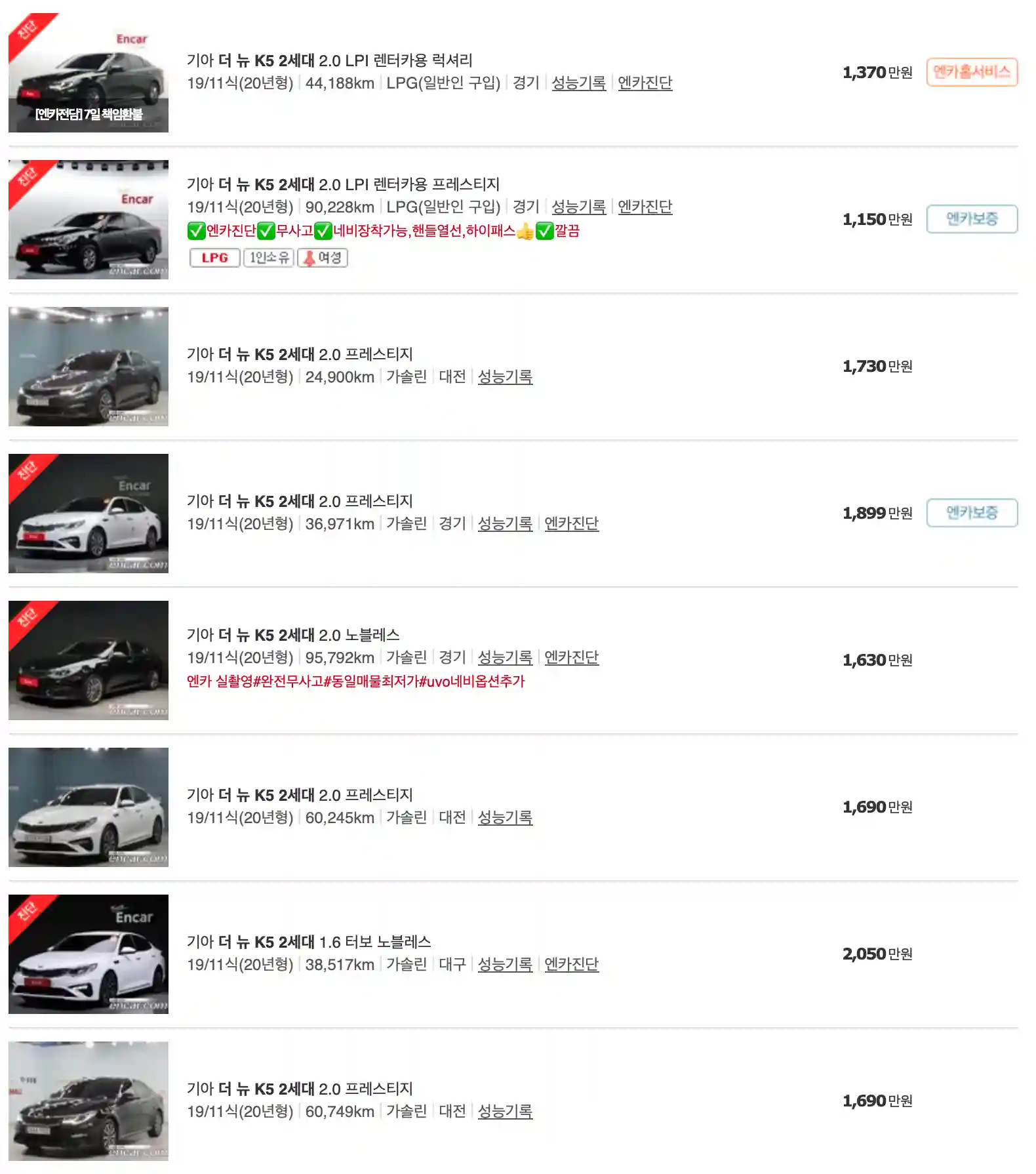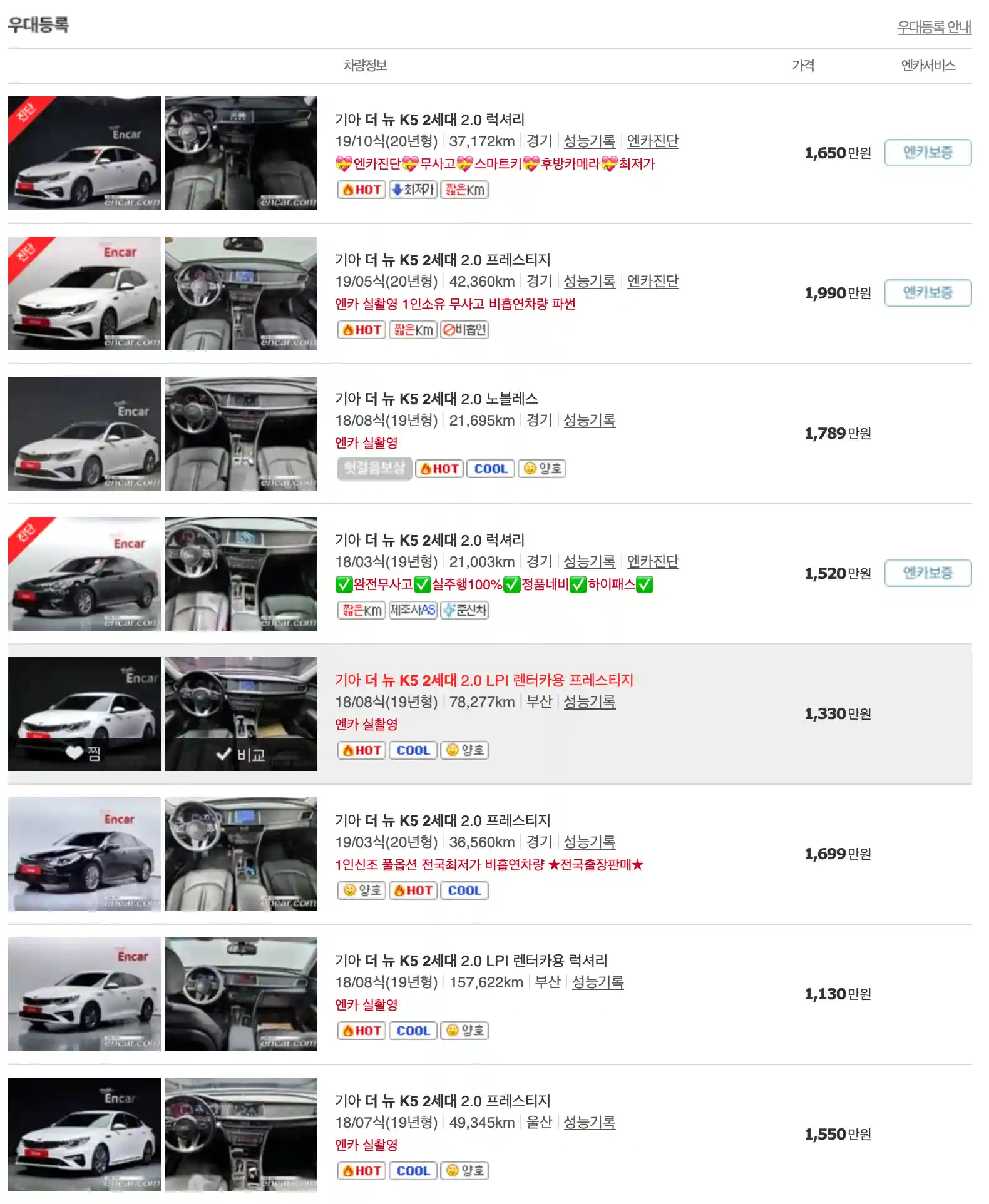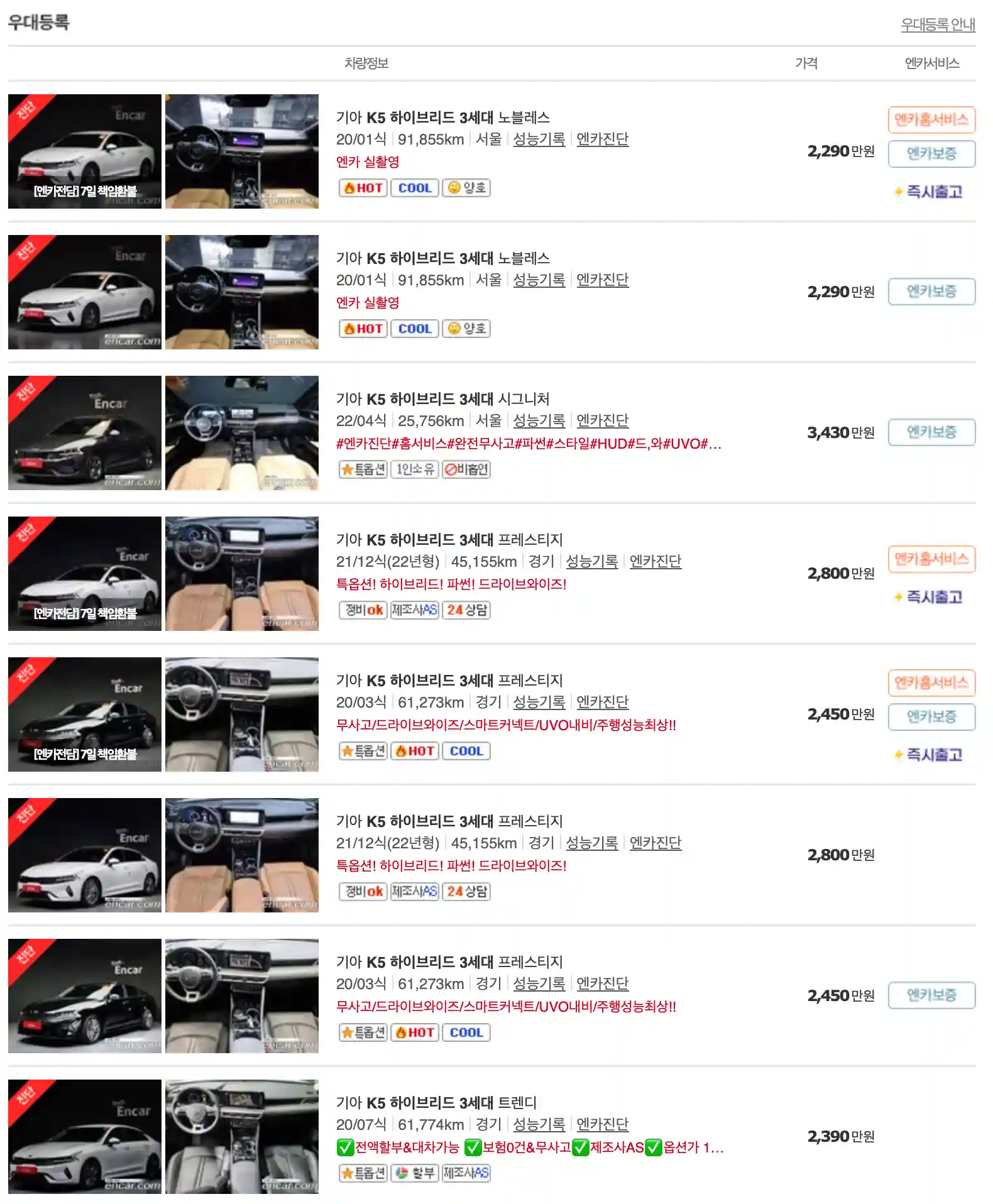 K5 중고차 가격을 모델별로 우대등록된 대표매물과 주행거리가 짧은 순으로 정렬했습니다. K5 신차 가격과 중고차 가격을 비교해보시고 연식, 무사고 여부, 선택 옵션 등 꼼꼼하게 확인해보시고 알아보시기 바랍니다. 인기가 많은 차종과 모델은 거래가 빠르게 이루어지기 때문에 엔카 홈페이지에 들어가셔서 실시간 거래 현황도 참고하시기 바랍니다.