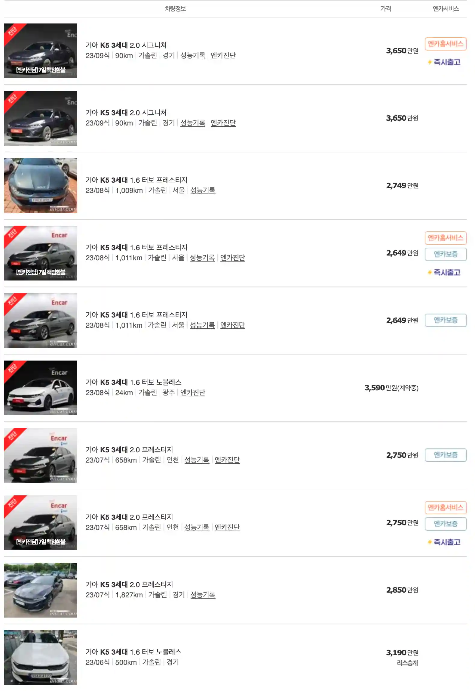 2023년 9월 엔카 플랫폼 K5 모델별 중고차 시세표입니다. K5 중고차 구입을 고려하고 계시다면 모델별 시세표를 참고하시고 원하시는 예산 금액에 좋은 매물을 구입하시기를 바랍니다.
