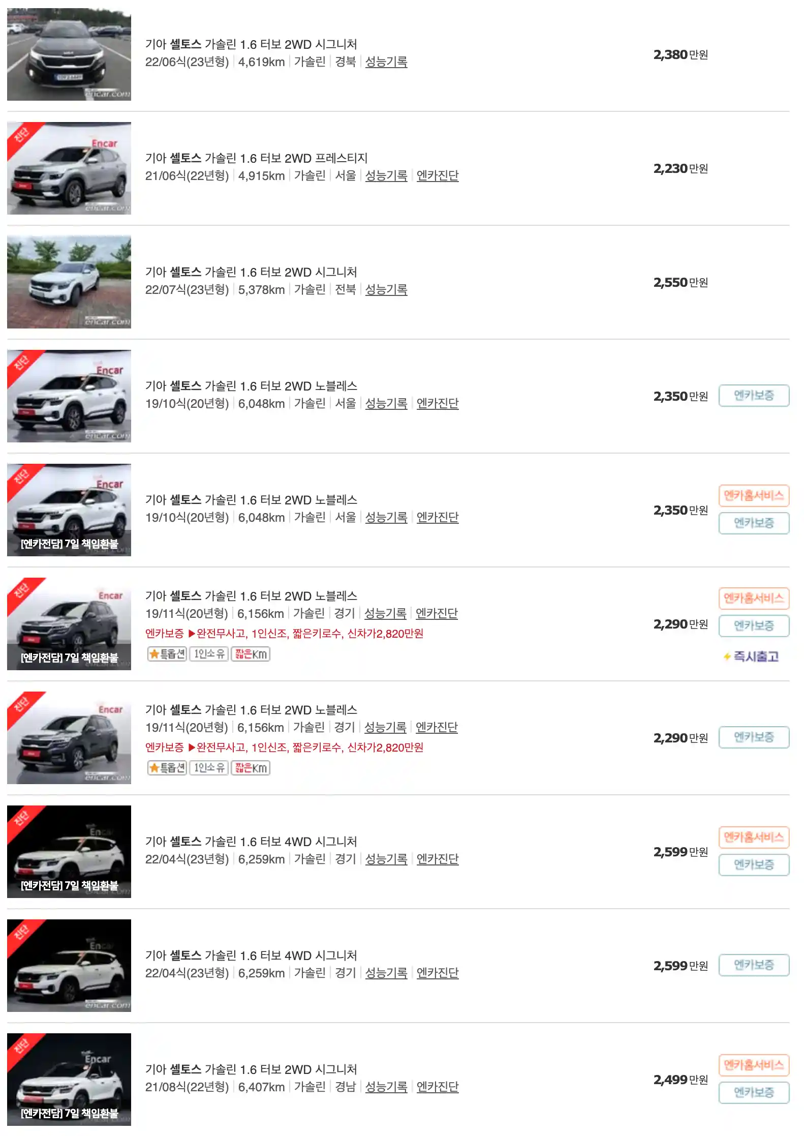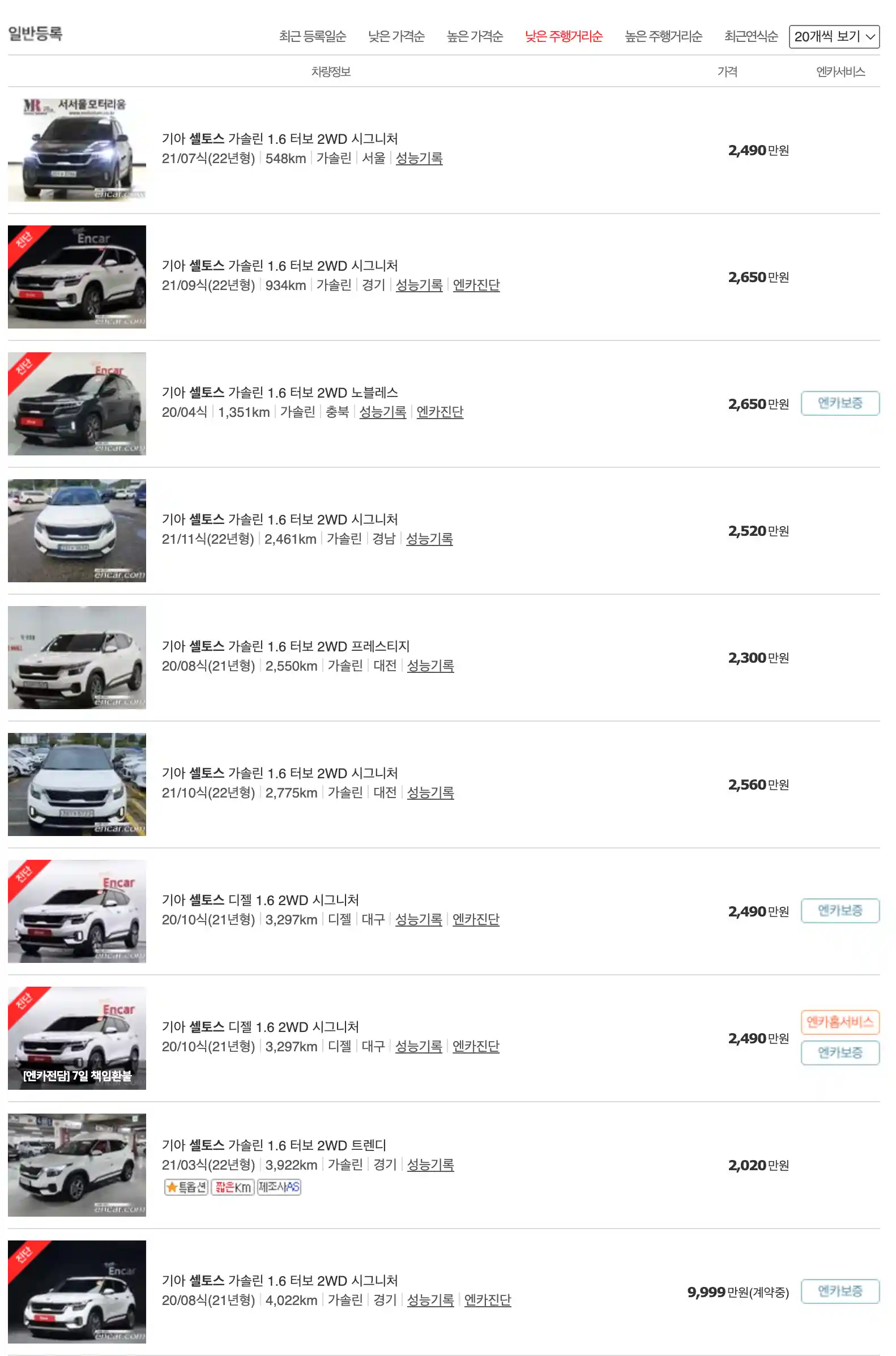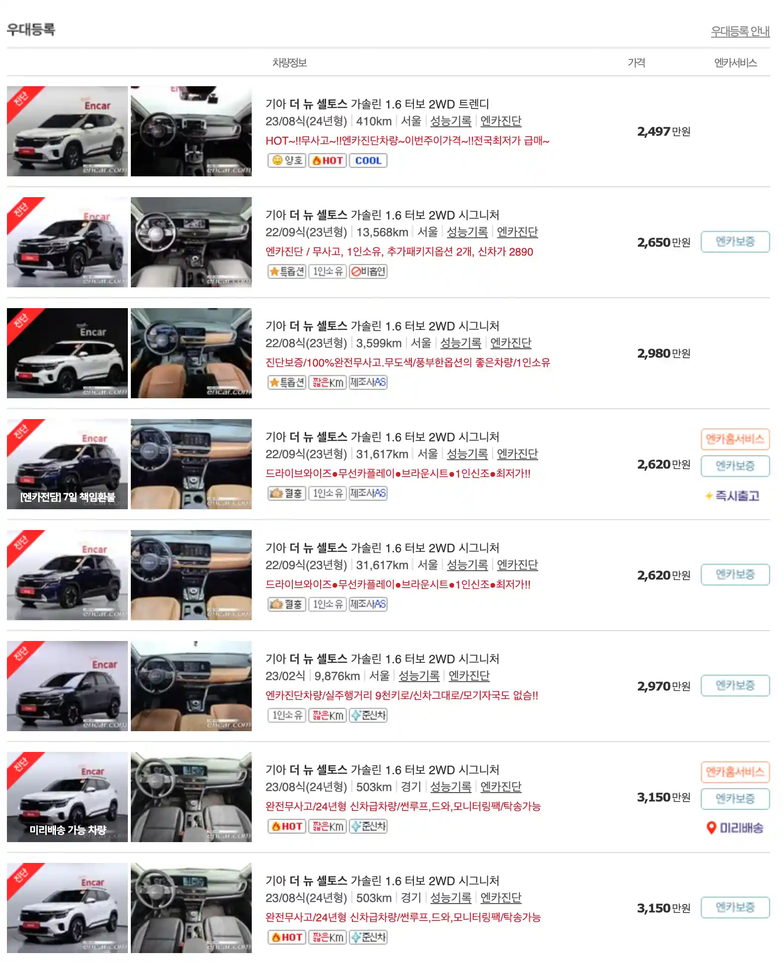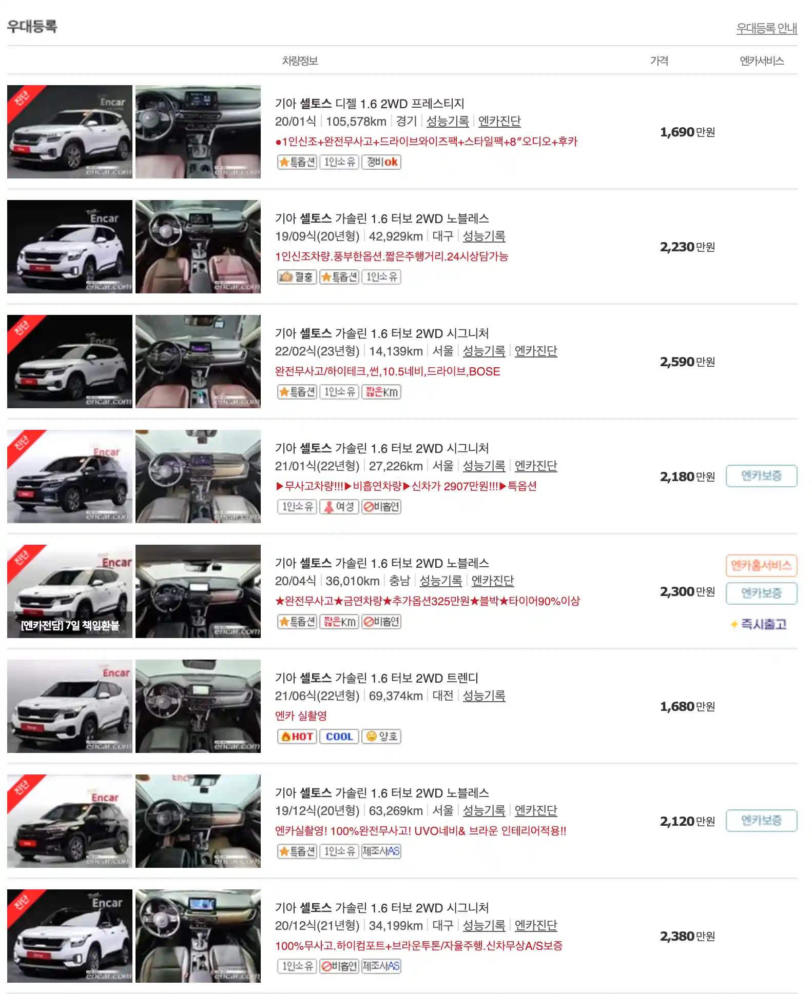 셀토스 중고차 가격을 모델별로 우대등록된 대표매물과 주행거리가 짧은 순으로 정렬했습니다. 셀토스 신차 가격과 중고차 가격을 비교해보시고 연식, 무사고 여부, 선택 옵션 등 꼼꼼하게 확인해보시고 알아보시기 바랍니다. 인기가 많은 차종과 모델은 거래가 빠르게 이루어지기 때문에 엔카 홈페이지에 들어가셔서 실시간 거래 현황도 참고하시기 바랍니다.