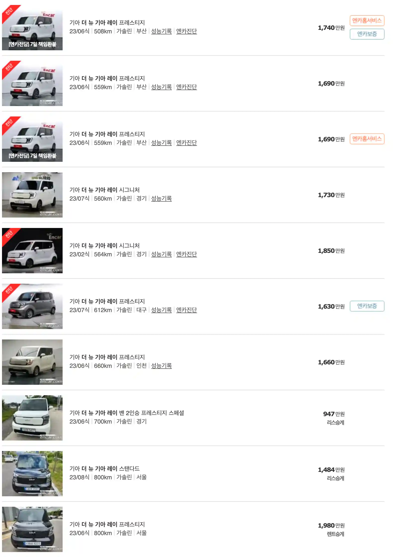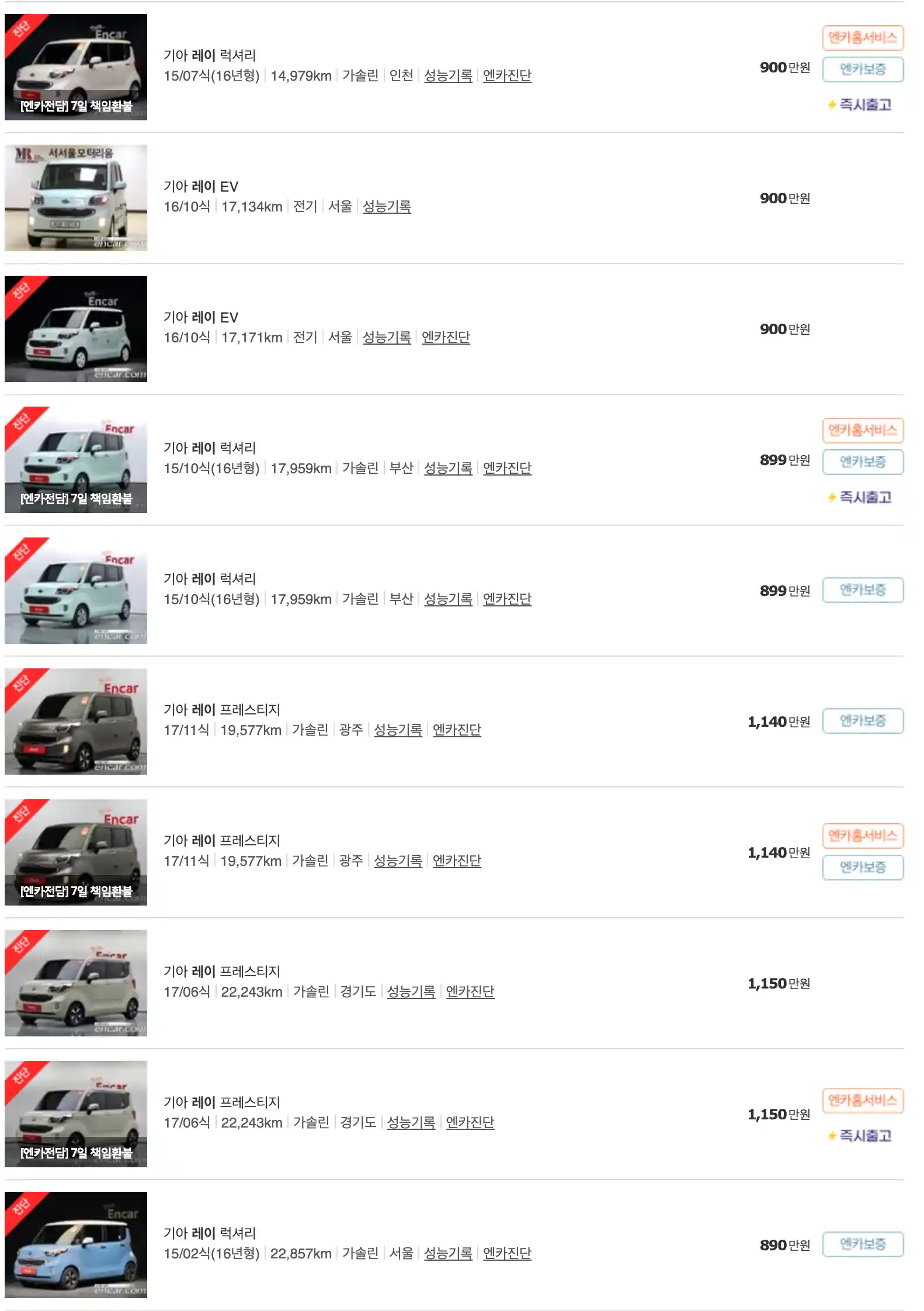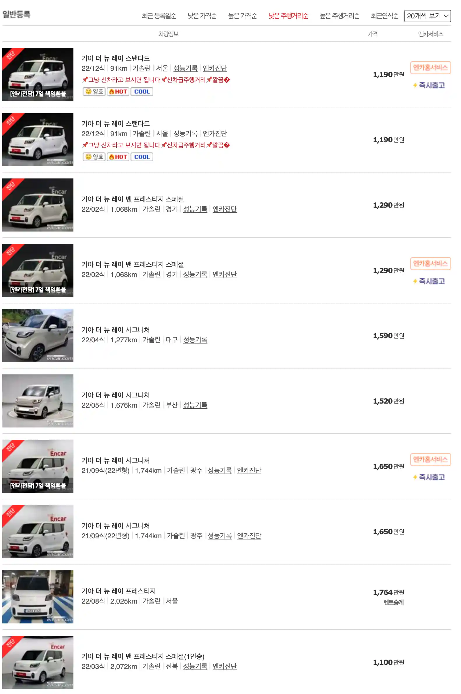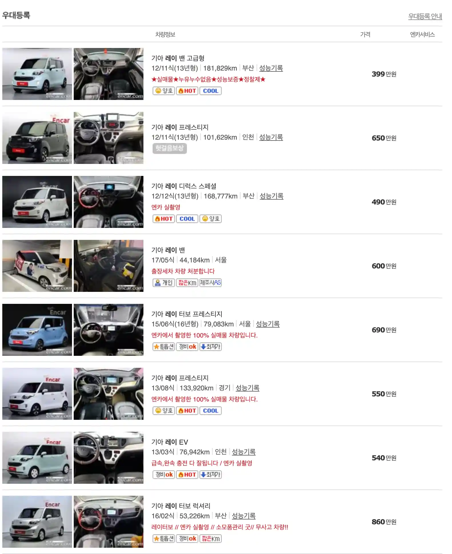 레이 중고차 가격을 모델별로 우대등록된 대표매물과 주행거리가 짧은 순으로 정렬했습니다. 레이 신차 가격과 중고차 가격을 비교해보시고 연식, 무사고 여부, 선택 옵션 등 꼼꼼하게 확인해보시고 알아보시기 바랍니다. 인기가 많은 차종과 모델은 거래가 빠르게 이루어지기 때문에 엔카 홈페이지에 들어가셔서 실시간 거래 현황도 참고하시기 바랍니다.