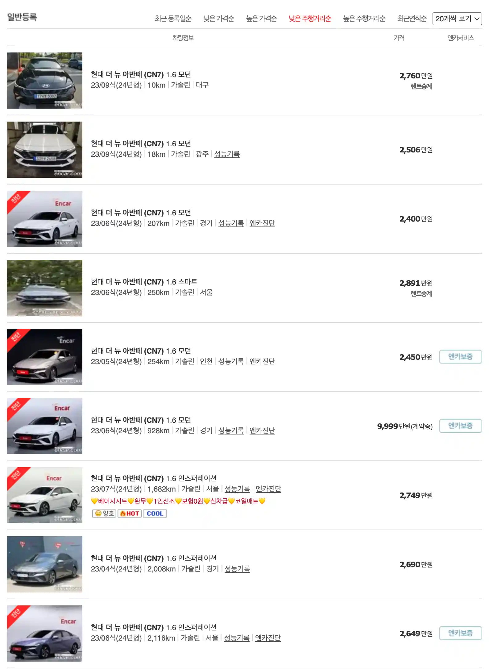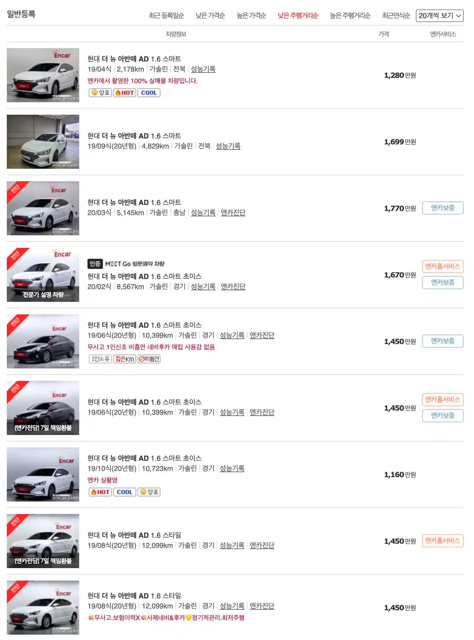 아반떼 중고차 가격을 모델별로 우대등록된 대표매물과 주행거리가 짧은 순으로 정렬했습니다. 아반떼 신차 가격과 중고차 가격을 비교해보시고 연식, 무사고 여부, 선택 옵션 등 꼼꼼하게 확인해보시고 알아보시기 바랍니다. 인기가 많은 차종과 모델은 거래가 빠르게 이루어지기 때문에 엔카 홈페이지에 들어가셔서 실시간 거래 현황도 참고하시기 바랍니다.