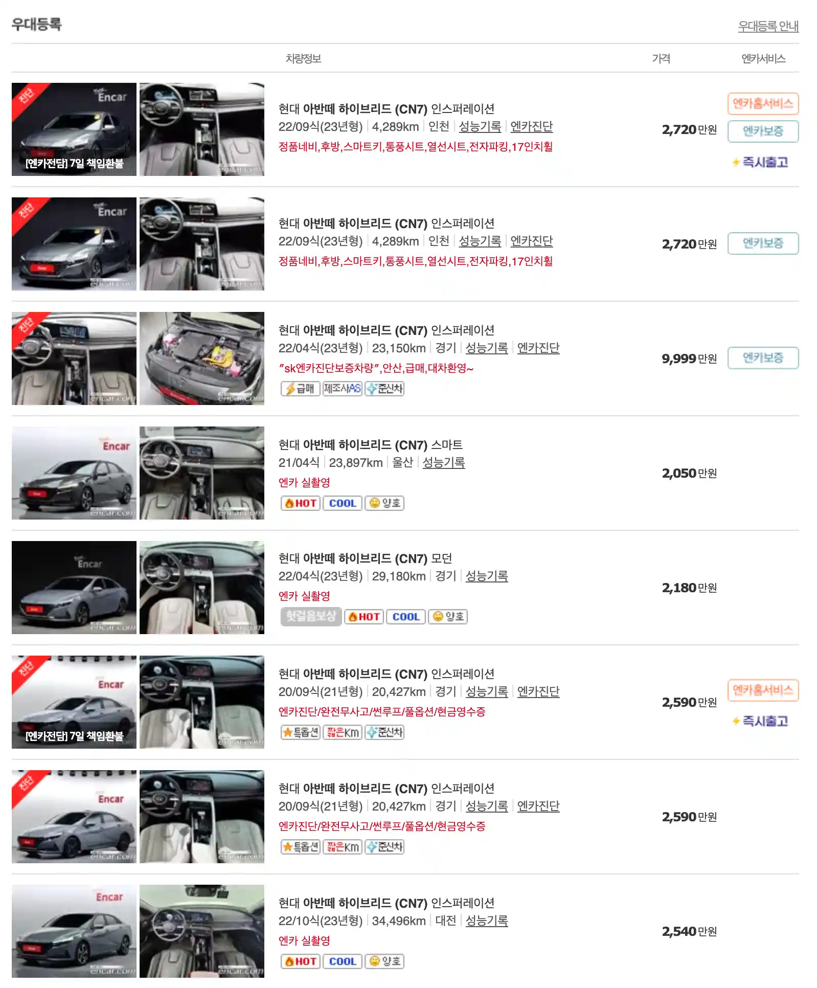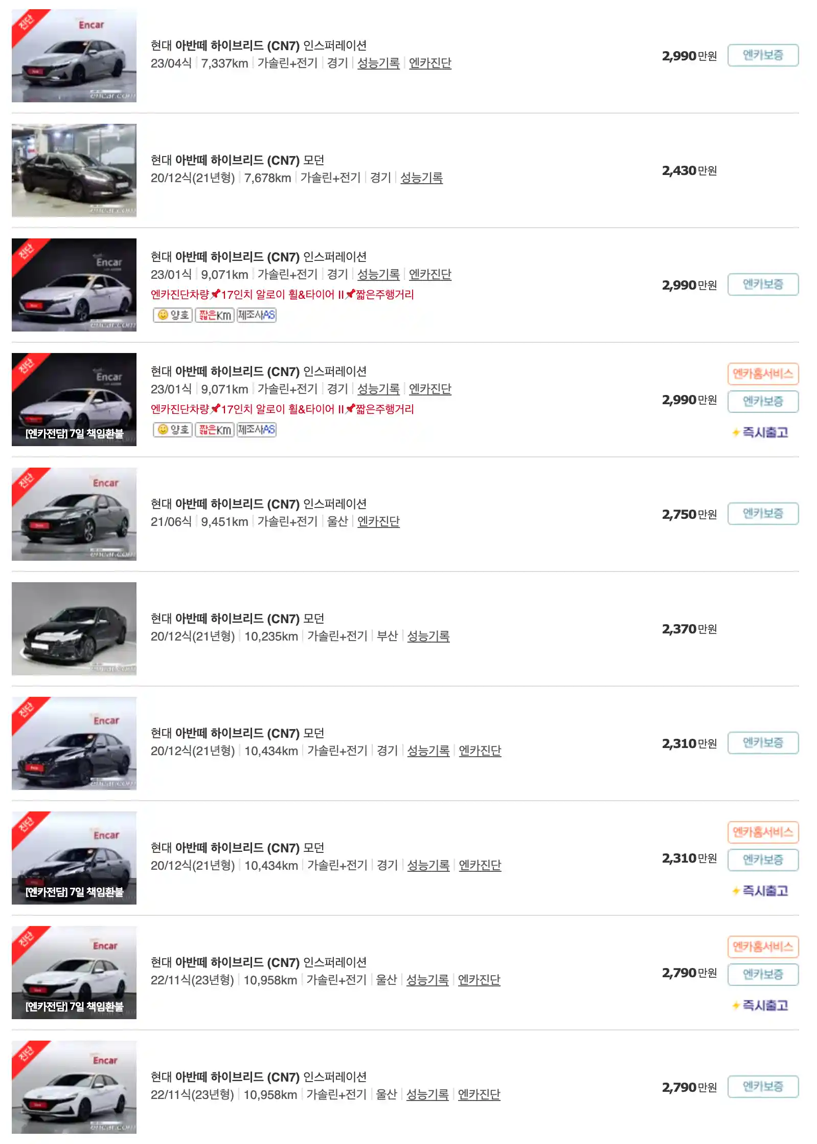2023년 10월 현대 아반떼 하이브리드 중고차 시세에 대해 알려드립니다. 시세표 기준은 중고차 거래가 가장 많이 일어나는 엔카 중고차 플랫폼을 참고했습니다.