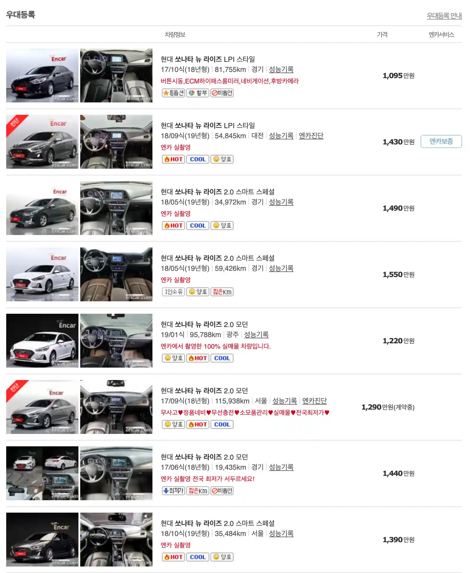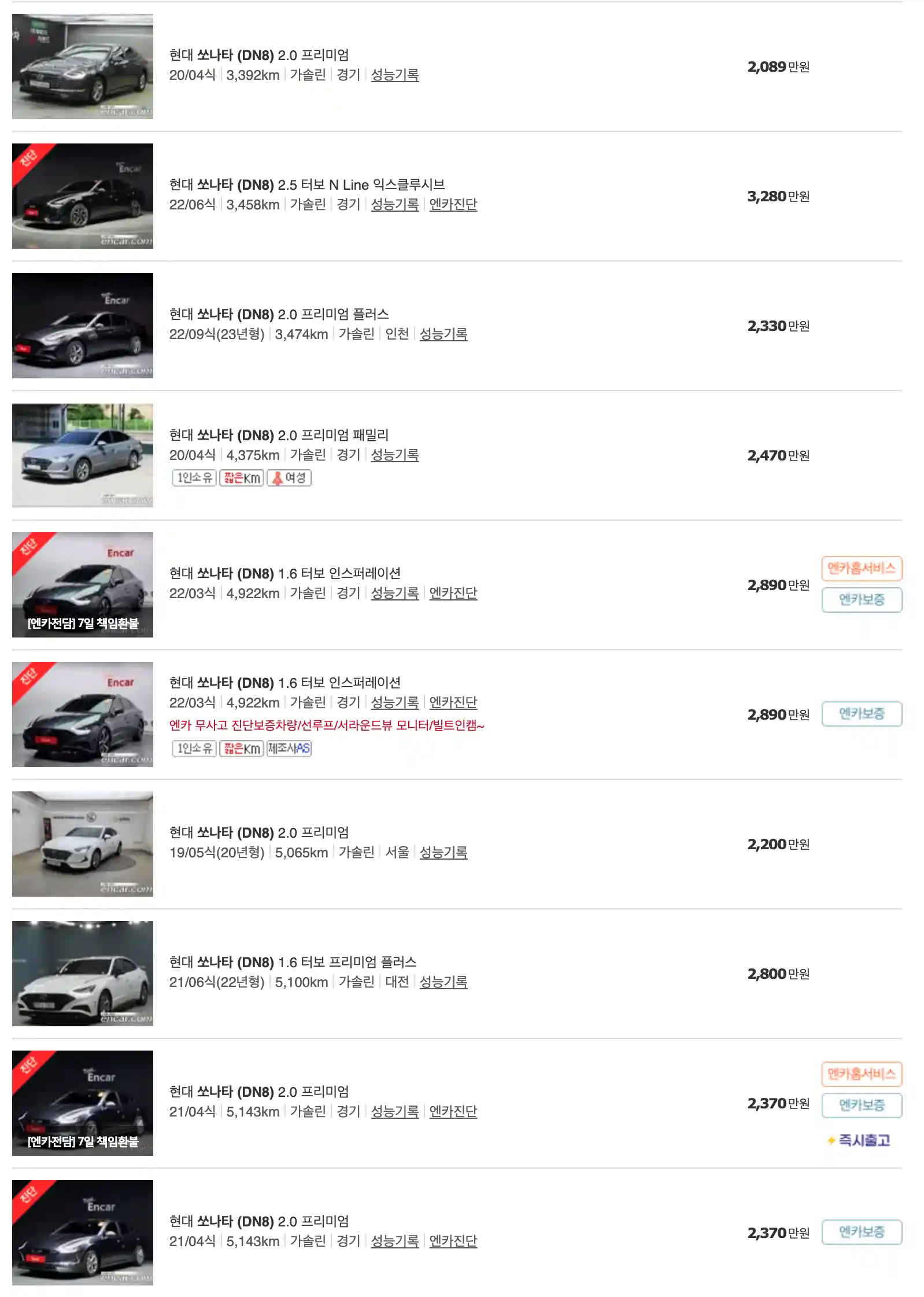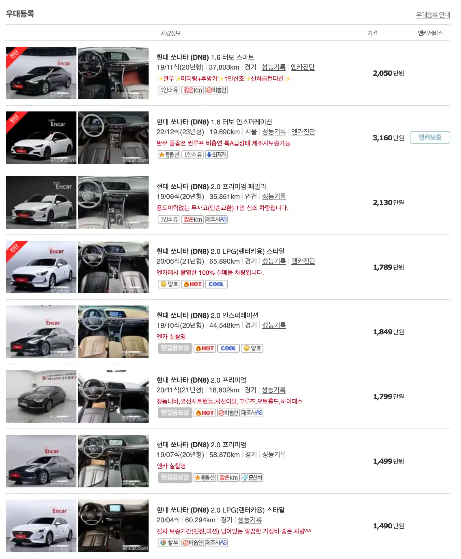 쏘나타 중고차 가격을 모델별로 우대등록된 대표매물과 주행거리가 짧은 순으로 정렬했습니다. 쏘나타 신차 가격과 중고차 가격을 비교해보시고 연식, 무사고 여부, 선택 옵션 등 꼼꼼하게 확인해보시고 알아보시기 바랍니다. 인기가 많은 차종과 모델은 거래가 빠르게 이루어지기 때문에 엔카 홈페이지에 들어가셔서 실시간 거래 현황도 참고하시기 바랍니다.