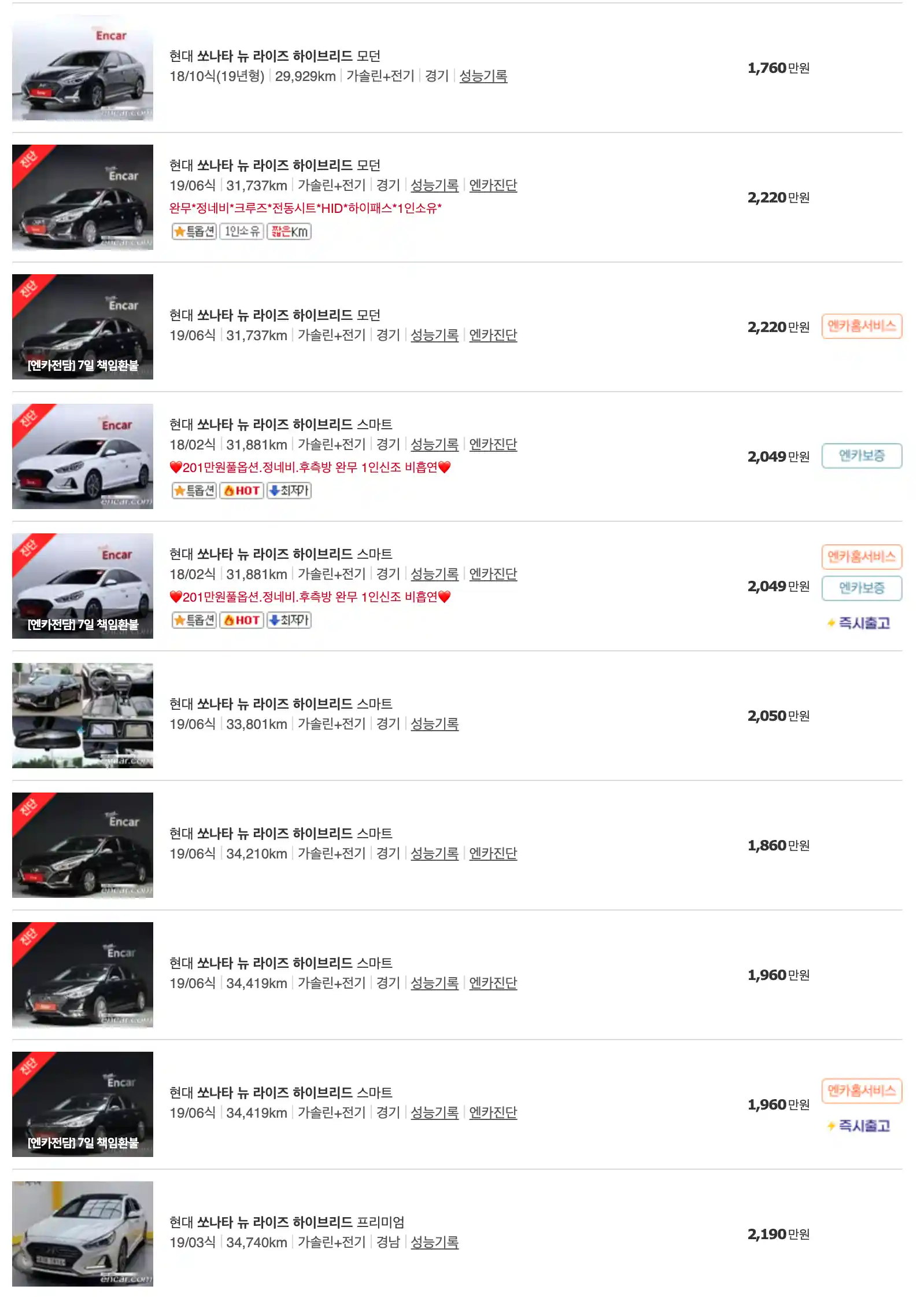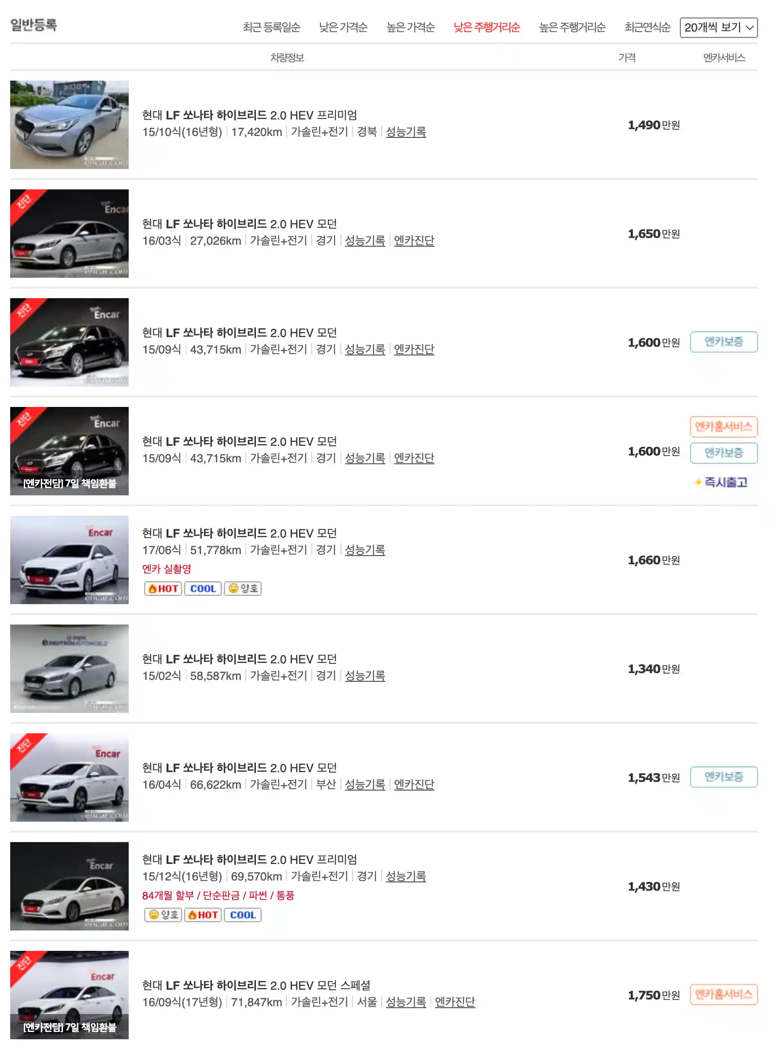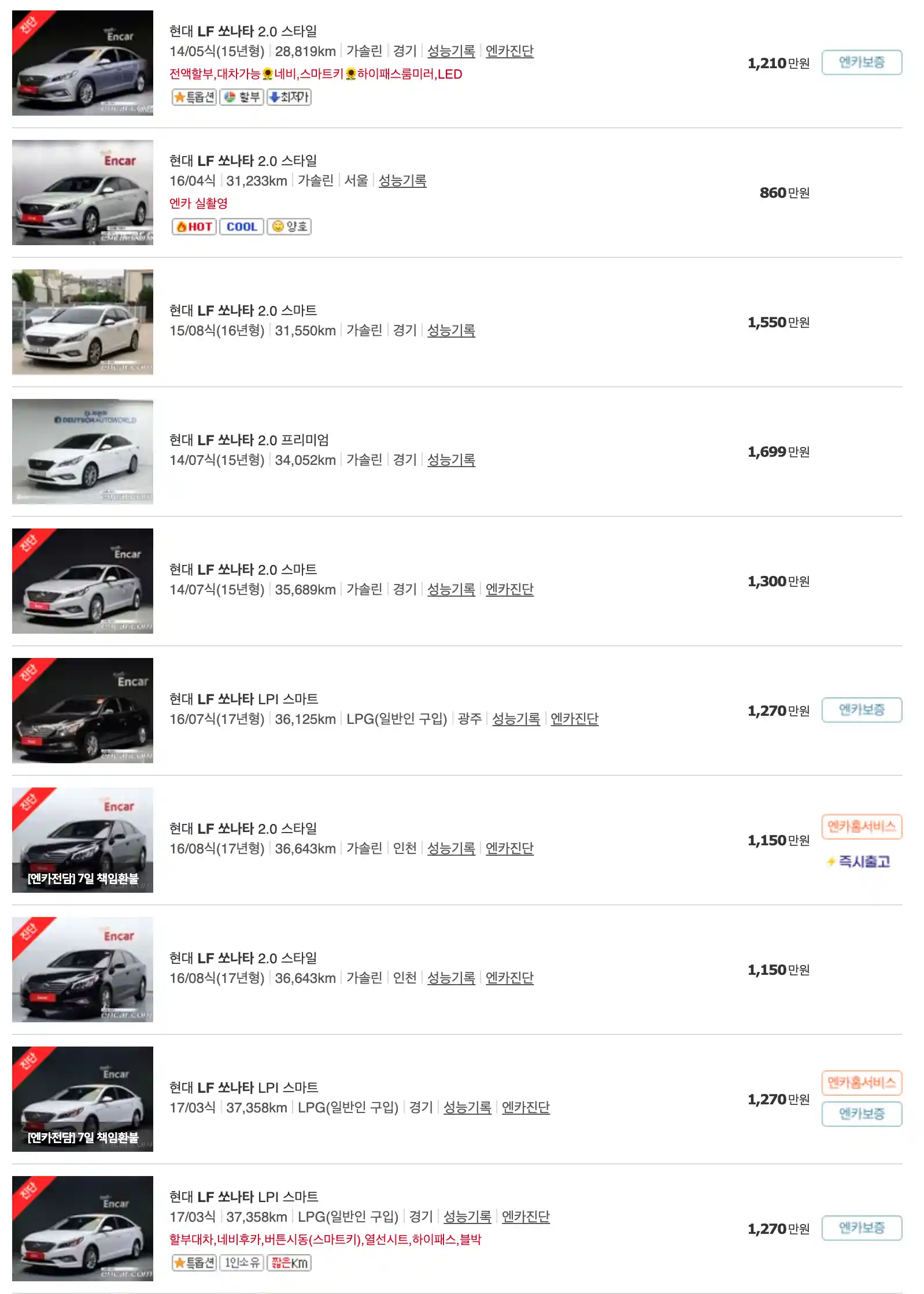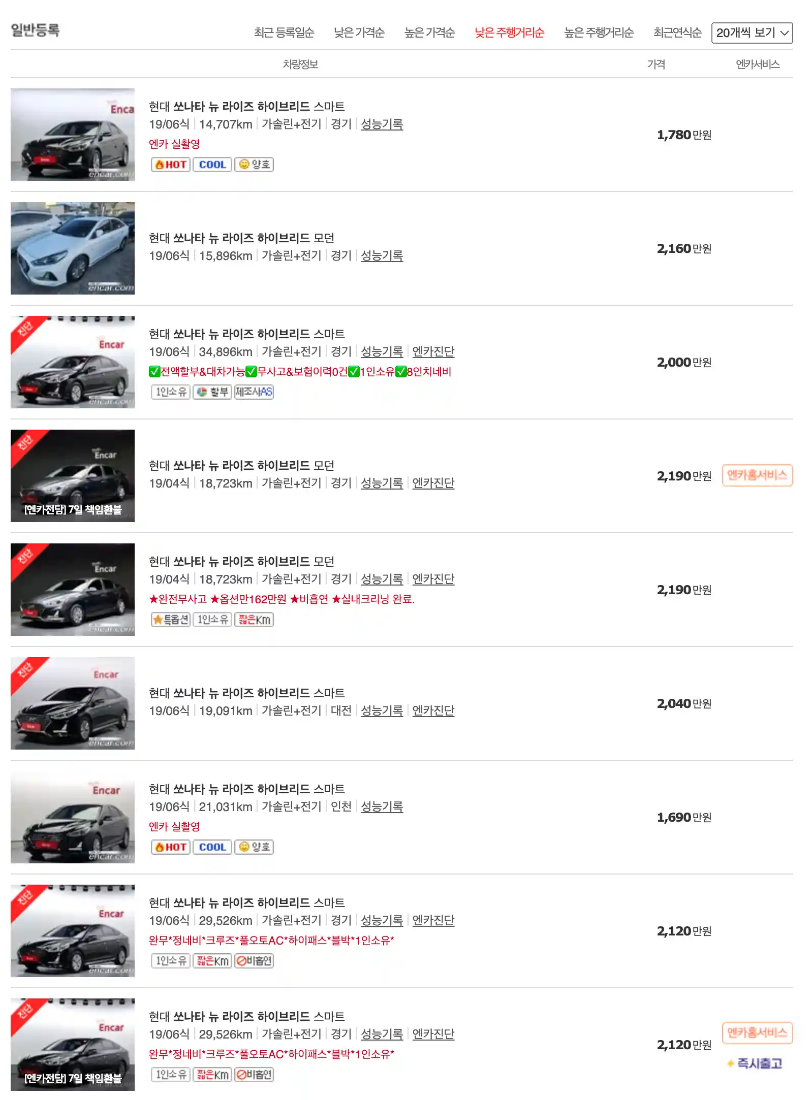 쏘나타 중고차 가격을 모델별로 우대등록된 대표매물과 주행거리가 짧은 순으로 정렬했습니다. 쏘나타 신차 가격과 중고차 가격을 비교해보시고 연식, 무사고 여부, 선택 옵션 등 꼼꼼하게 확인해보시고 알아보시기 바랍니다. 인기가 많은 차종과 모델은 거래가 빠르게 이루어지기 때문에 엔카 홈페이지에 들어가셔서 실시간 거래 현황도 참고하시기 바랍니다.