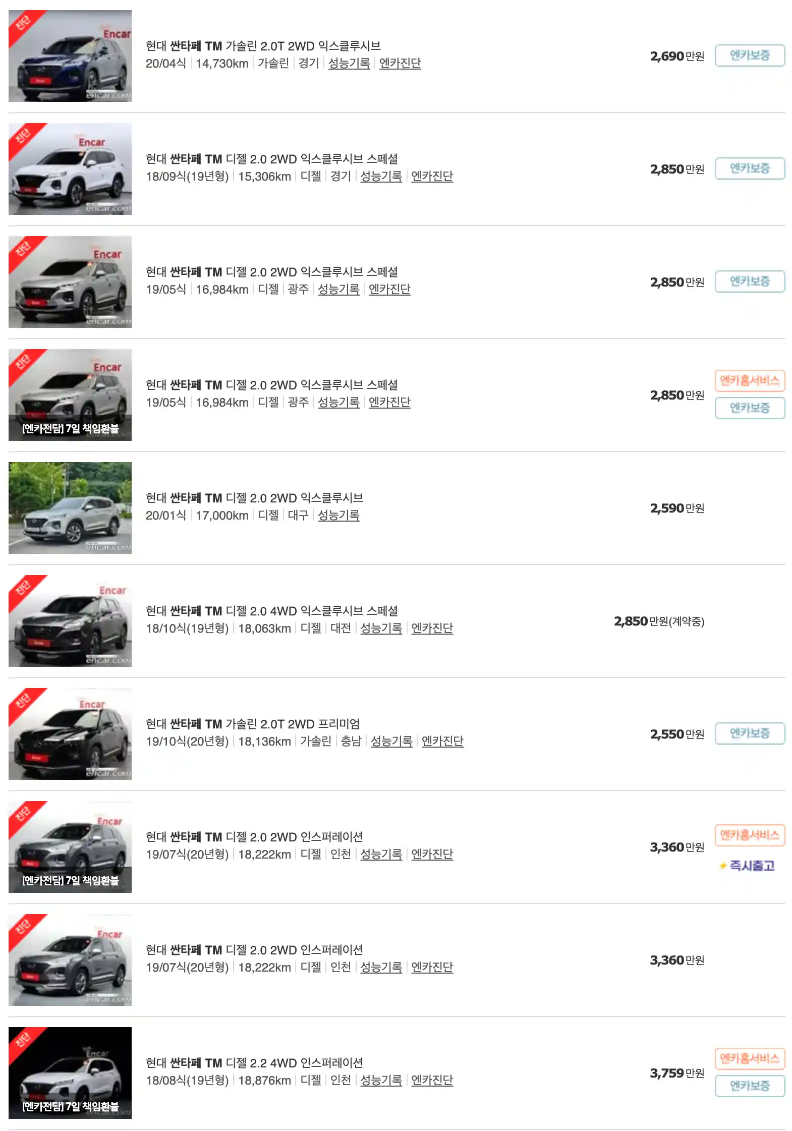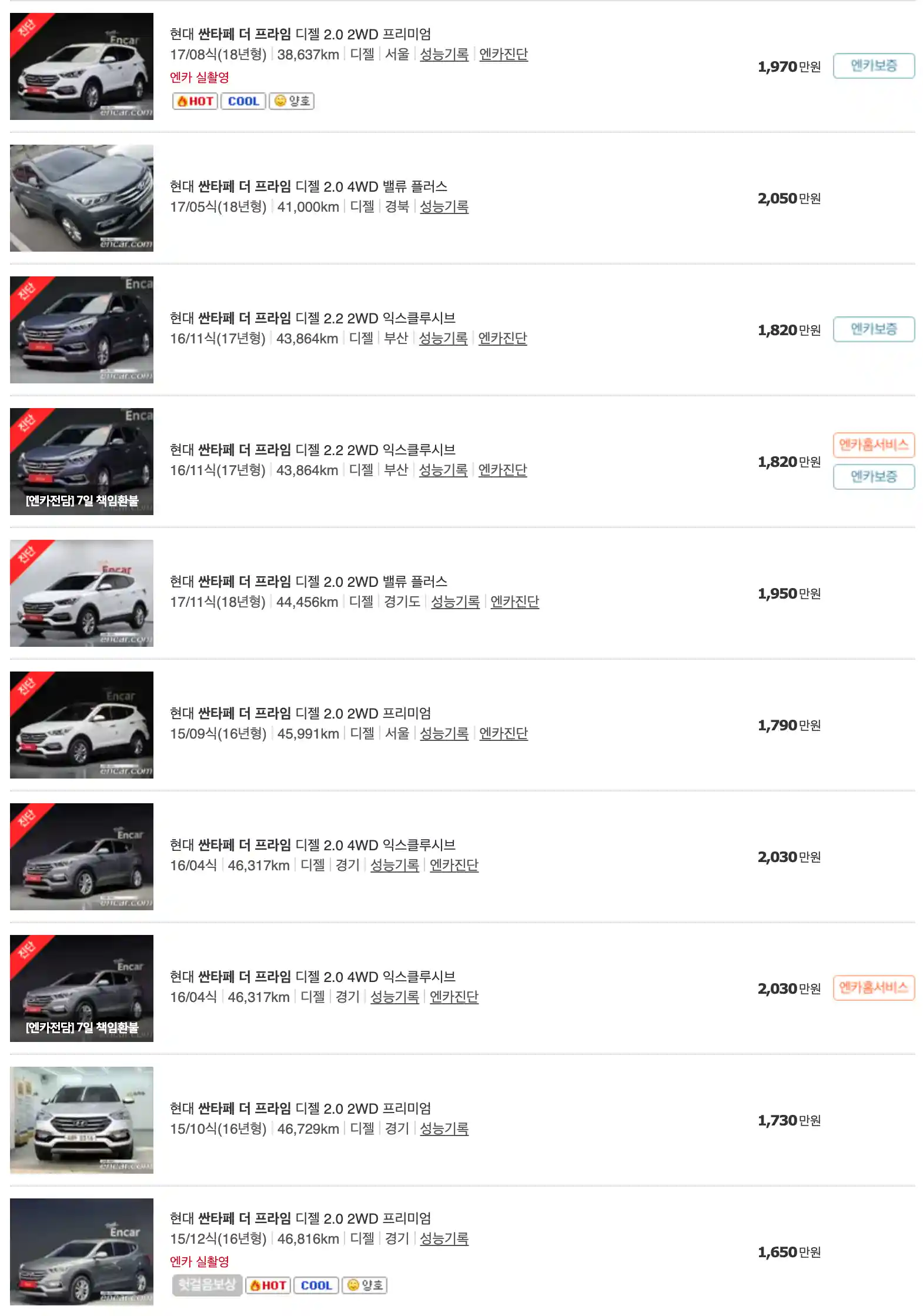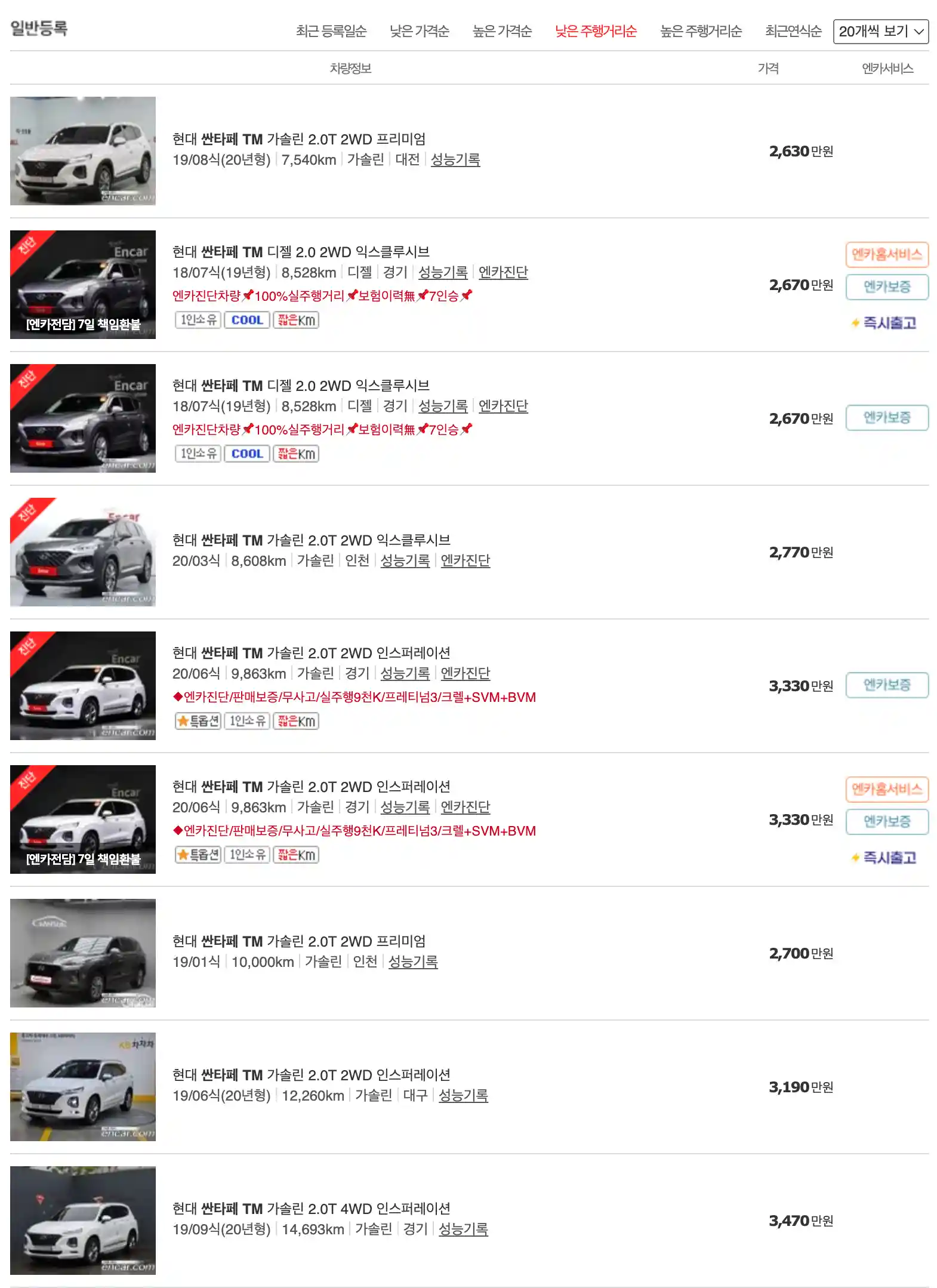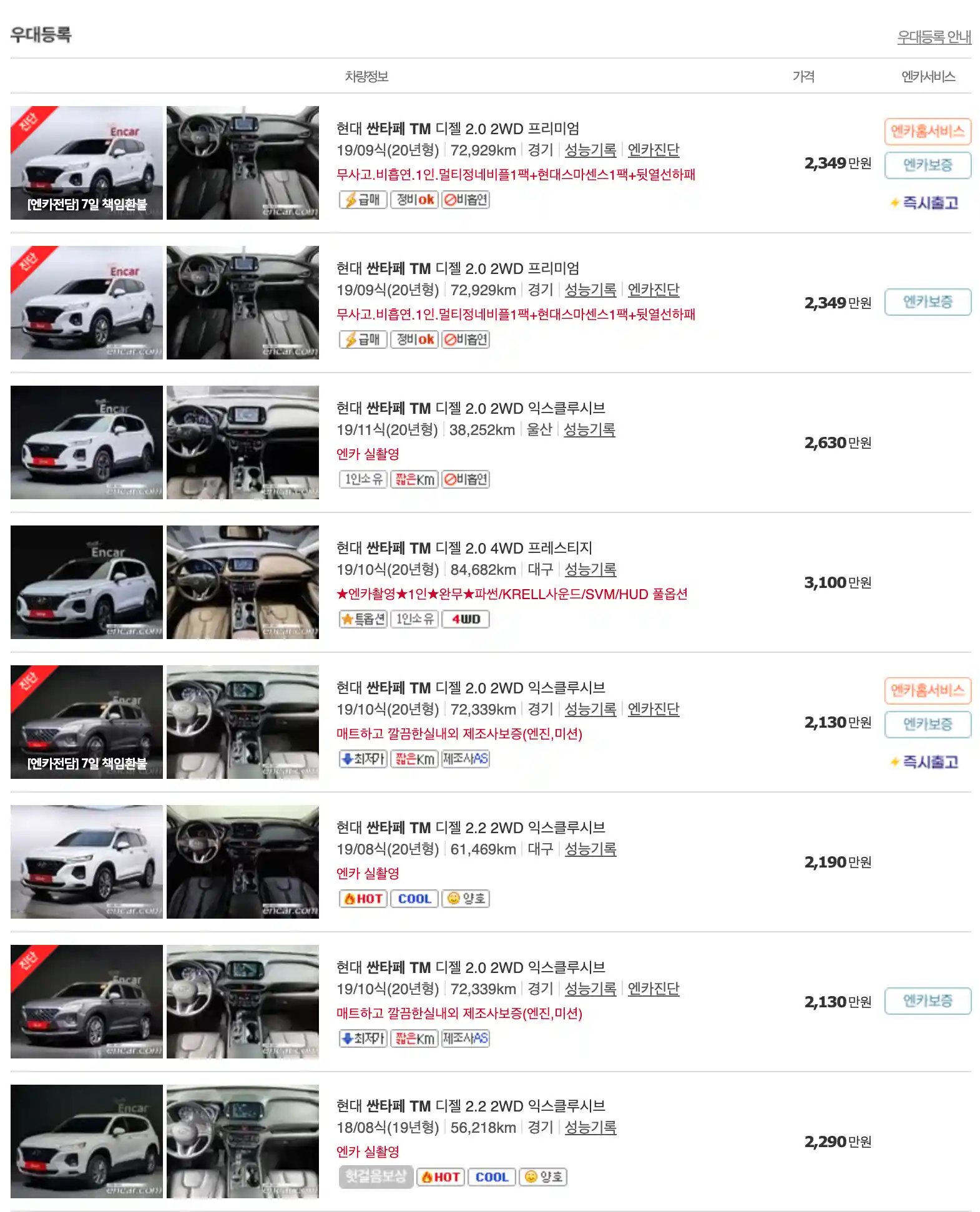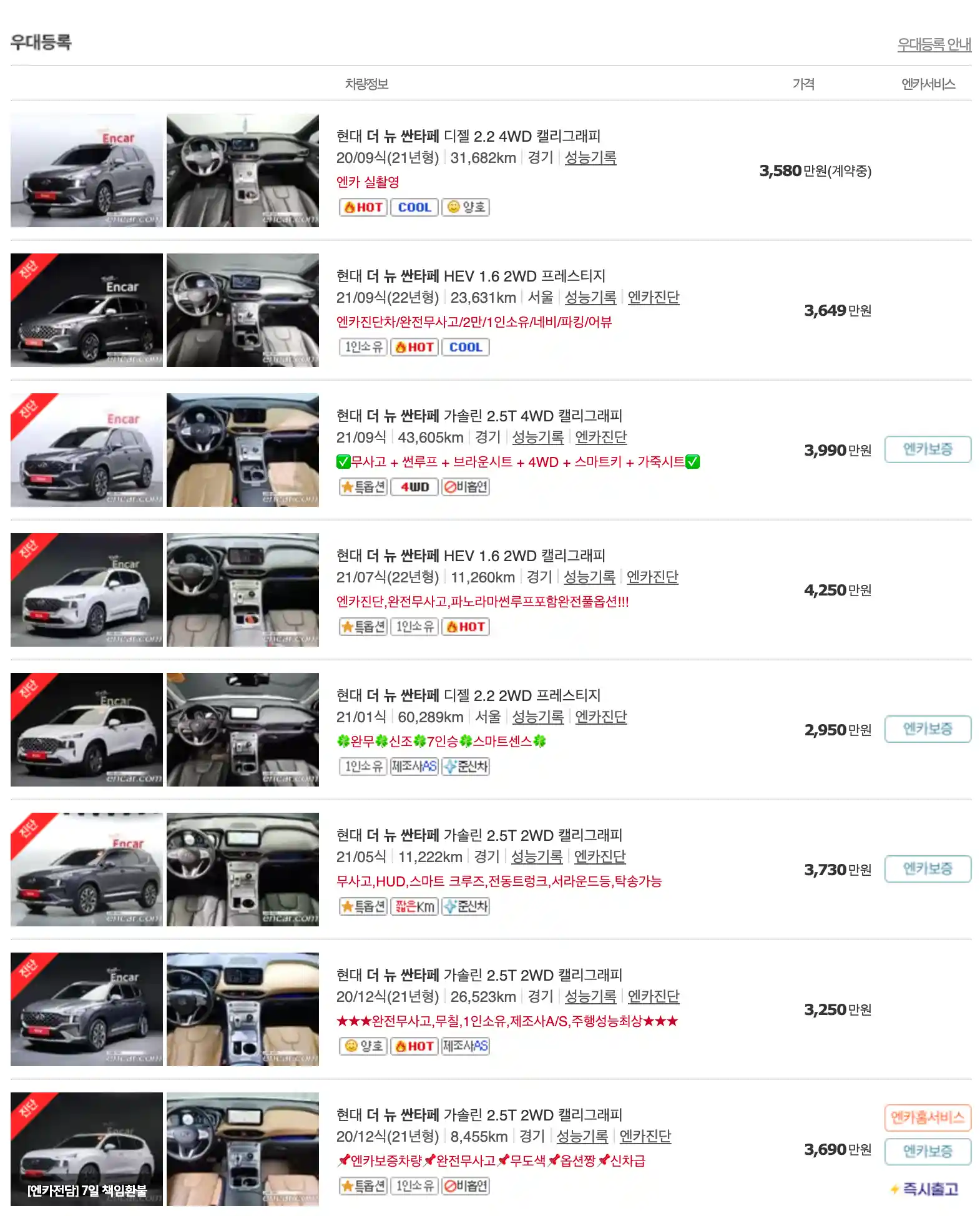 싼타페 중고차 가격을 모델별로 우대등록된 대표매물과 주행거리가 짧은 순으로 정렬했습니다. 싼타페 신차 가격과 중고차 가격을 비교해보시고 연식, 무사고 여부, 선택 옵션 등 꼼꼼하게 확인해보시고 알아보시기 바랍니다. 인기가 많은 차종과 모델은 거래가 빠르게 이루어지기 때문에 엔카 홈페이지에 들어가셔서 실시간 거래 현황도 참고하시기 바랍니다.