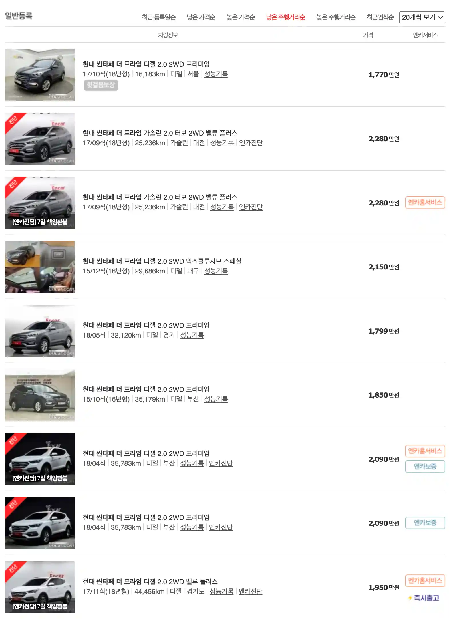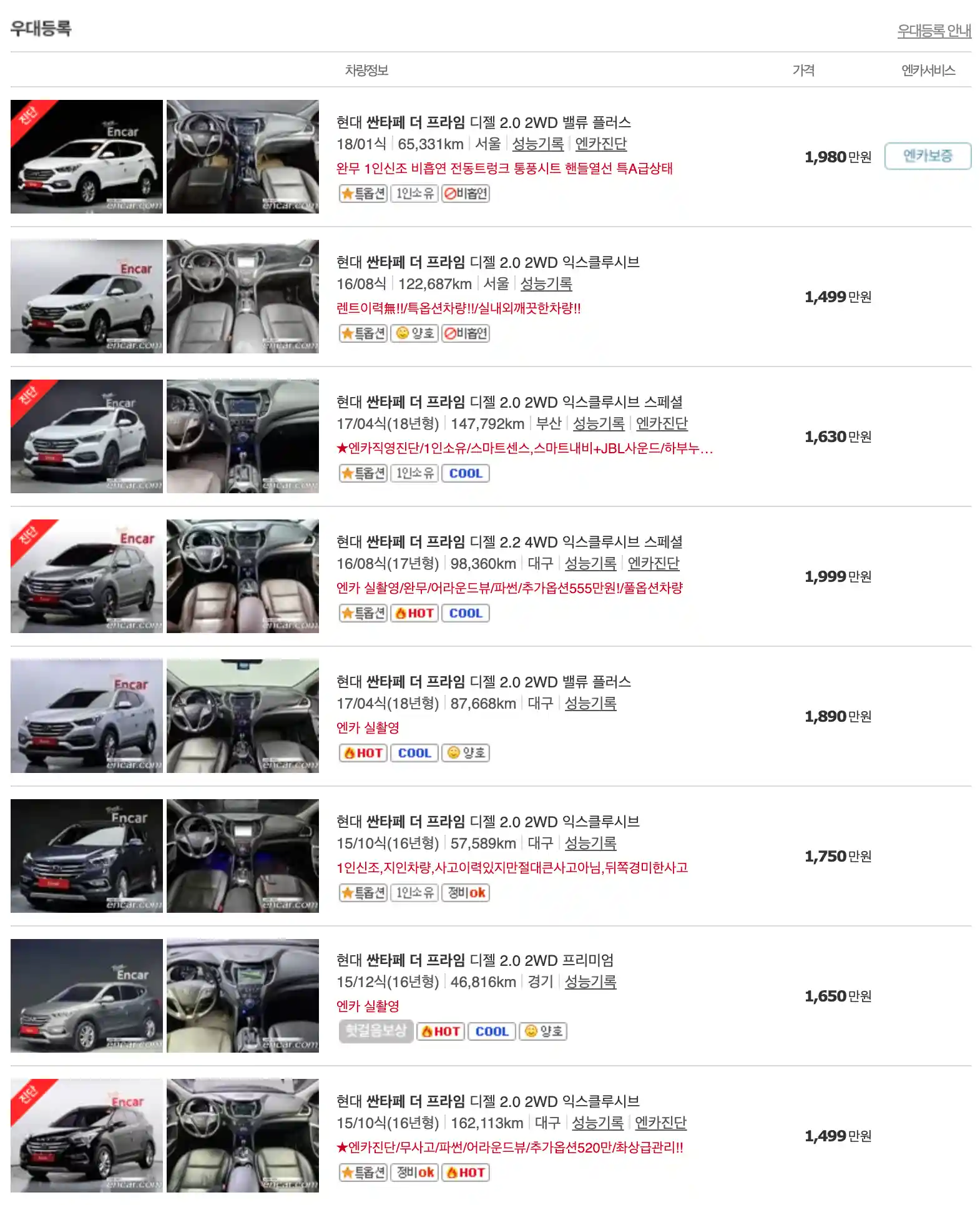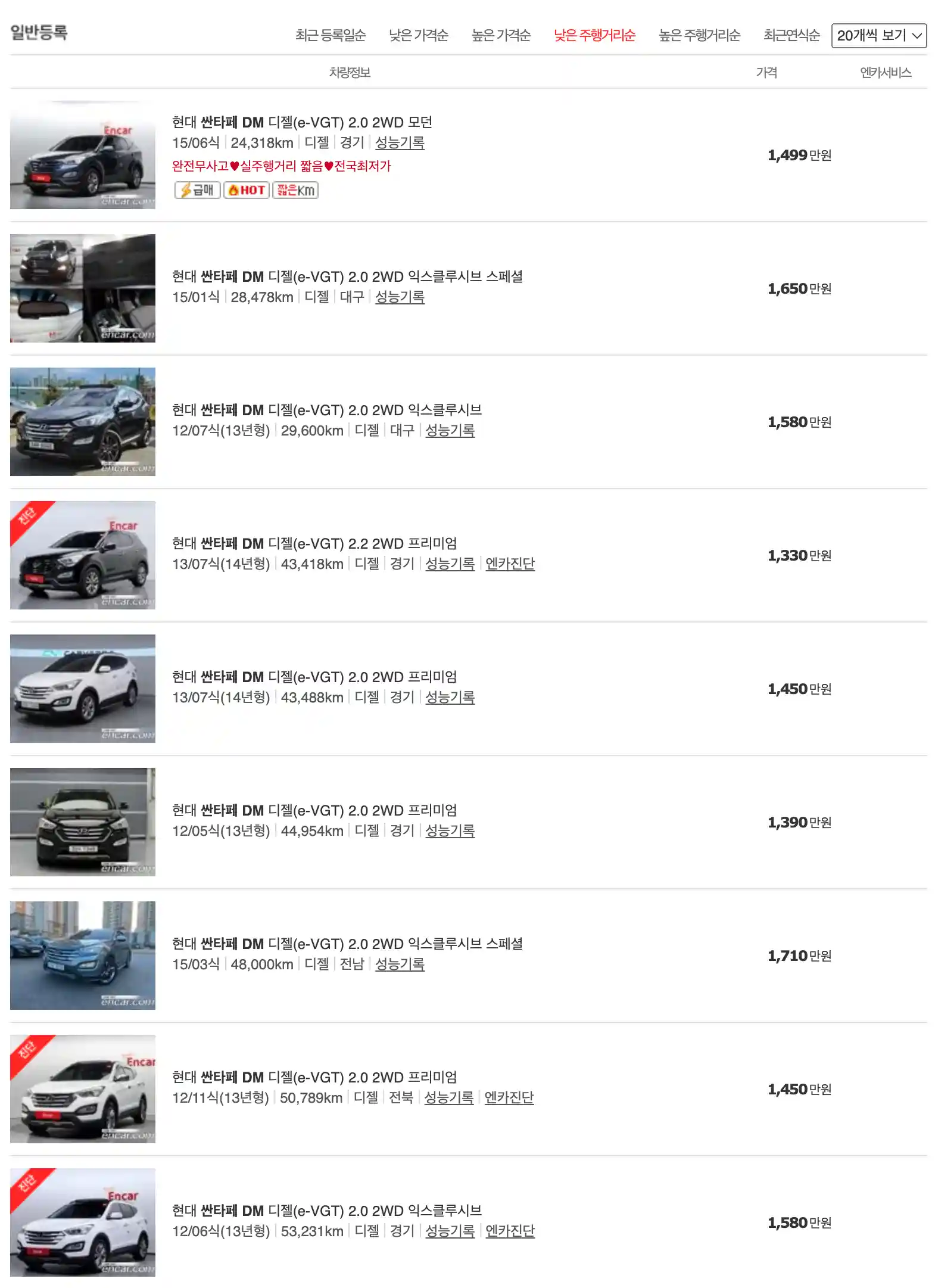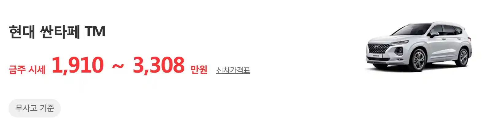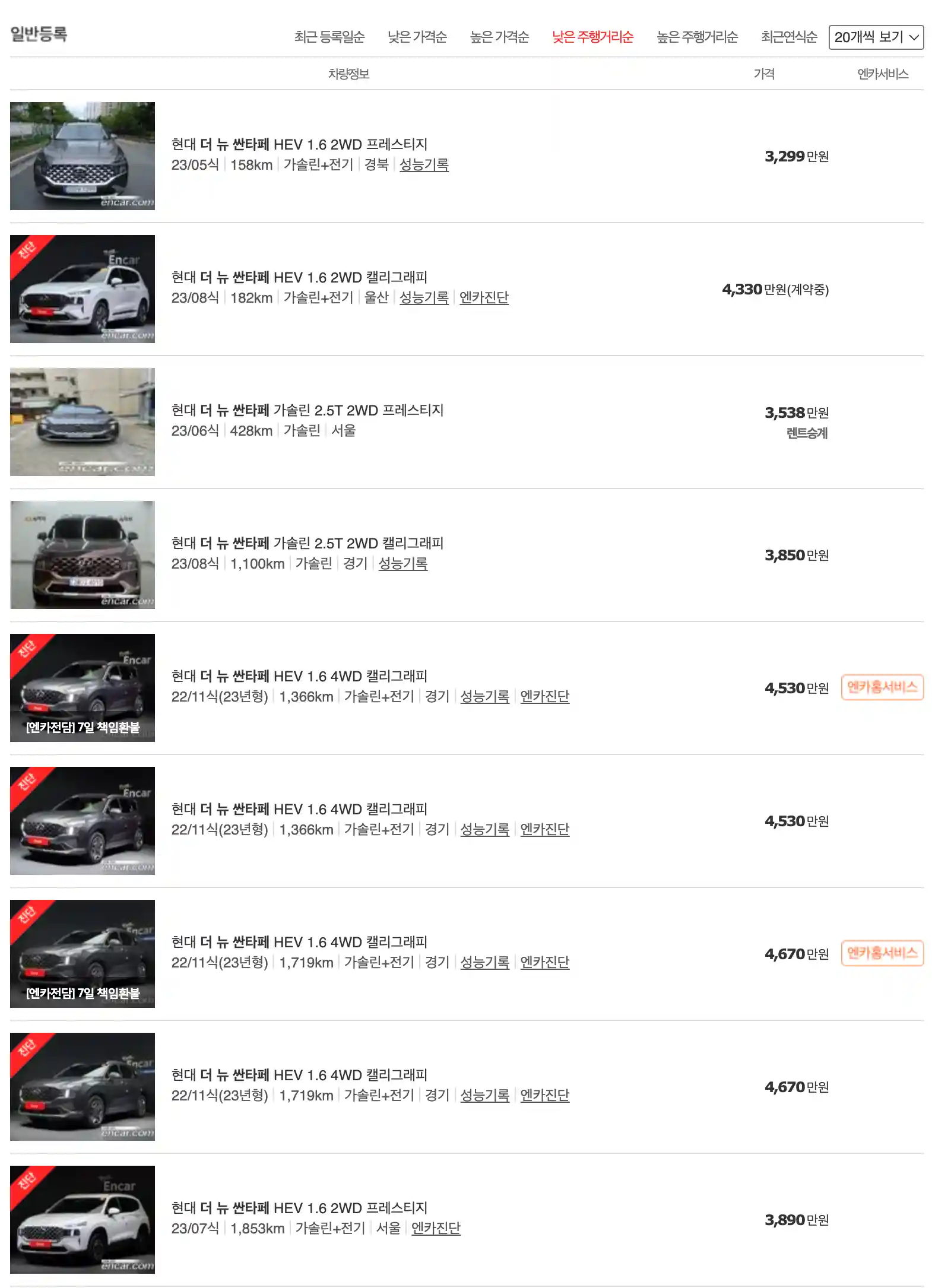 싼타페 중고차 가격을 모델별로 우대등록된 대표매물과 주행거리가 짧은 순으로 정렬했습니다. 싼타페 신차 가격과 중고차 가격을 비교해보시고 연식, 무사고 여부, 선택 옵션 등 꼼꼼하게 확인해보시고 알아보시기 바랍니다. 인기가 많은 차종과 모델은 거래가 빠르게 이루어지기 때문에 엔카 홈페이지에 들어가셔서 실시간 거래 현황도 참고하시기 바랍니다.