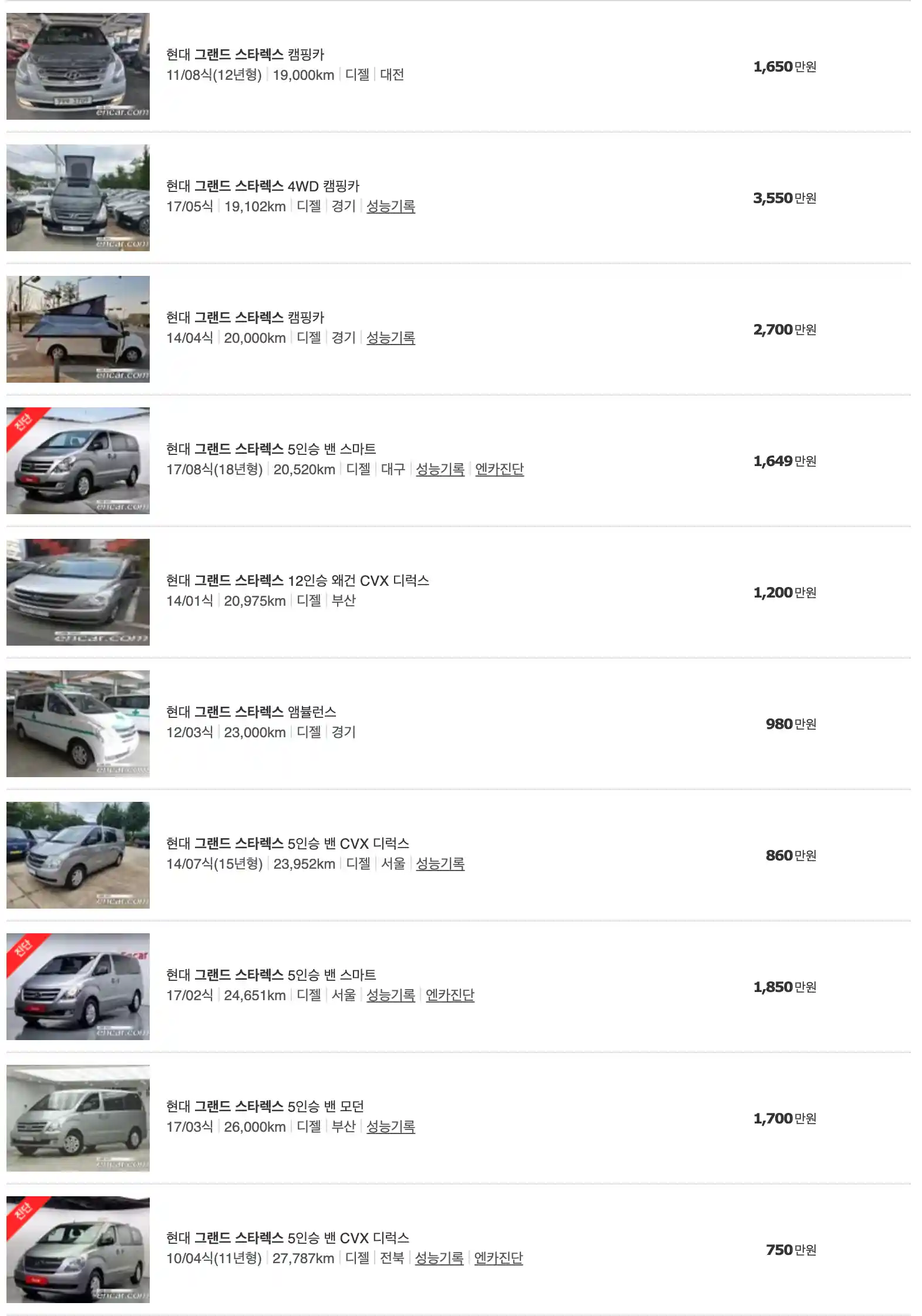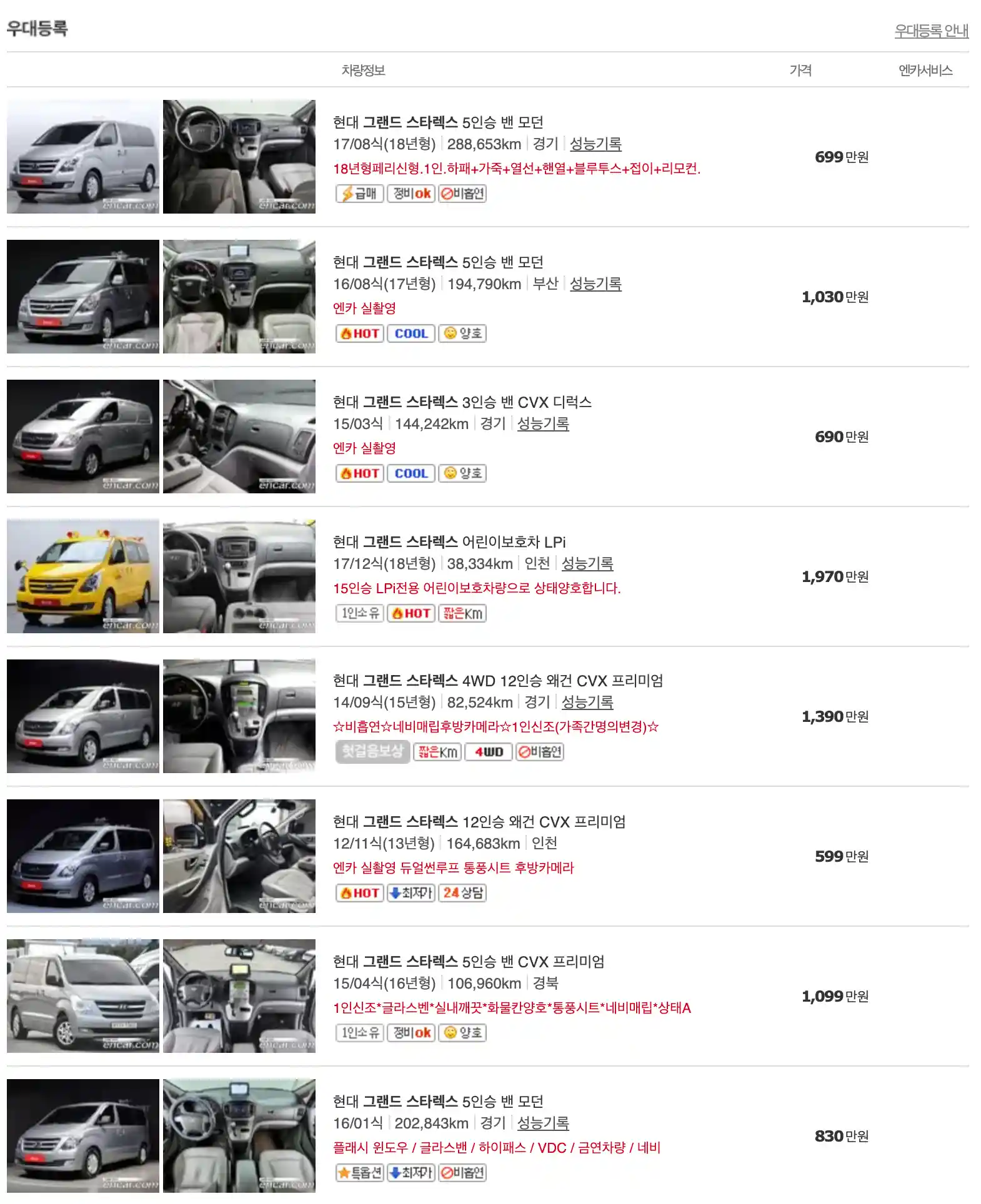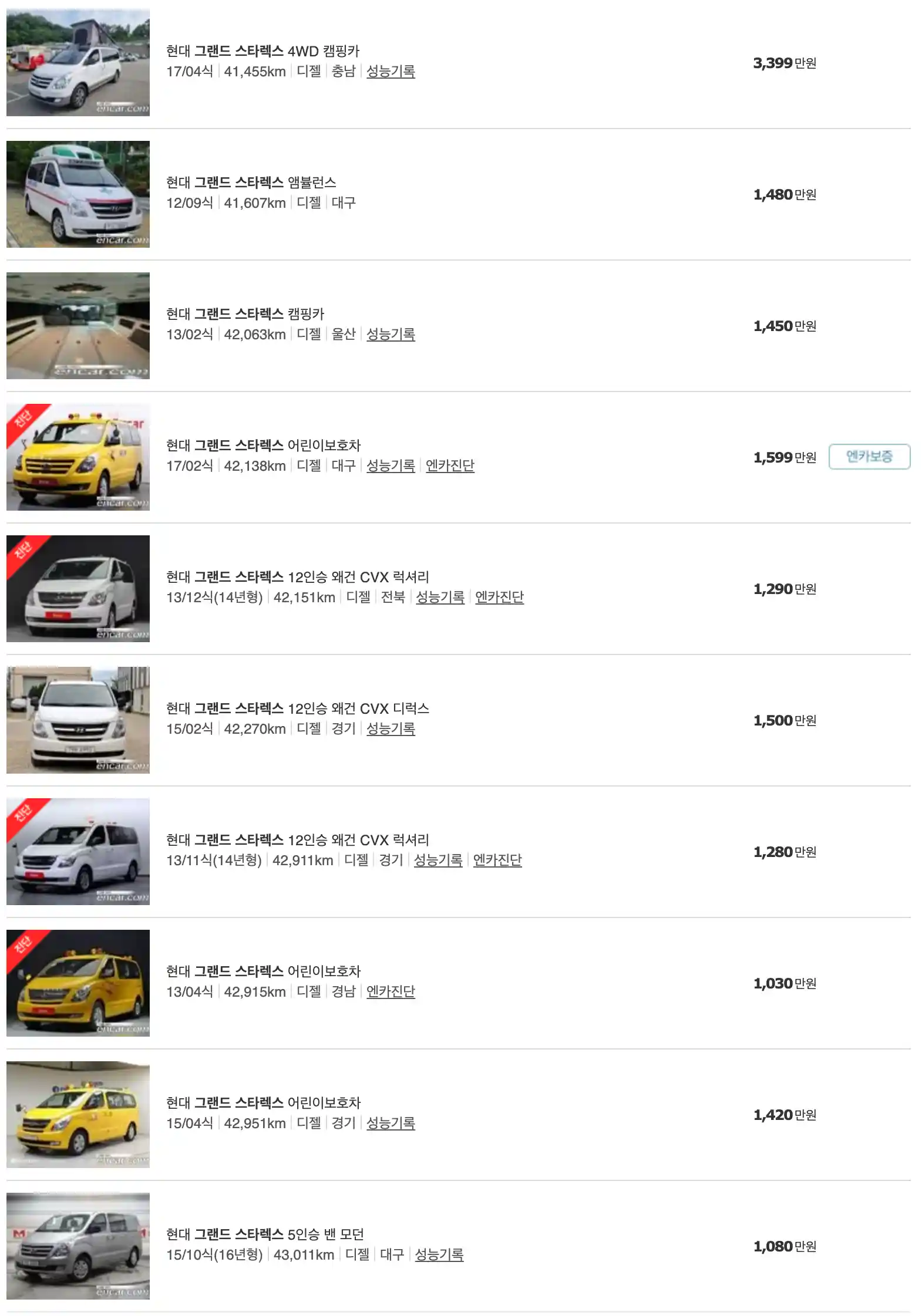 스타렉스 중고차 가격을 모델별로 우대등록된 대표매물과 주행거리가 짧은 순으로 정렬했습니다. 스타렉스 신차 가격과 중고차 가격을 비교해보시고 연식, 무사고 여부, 선택 옵션 등 꼼꼼하게 확인해보시고 알아보시기 바랍니다. 인기가 많은 차종과 모델은 거래가 빠르게 이루어지기 때문에 엔카 홈페이지에 들어가셔서 실시간 거래 현황도 참고하시기 바랍니다.