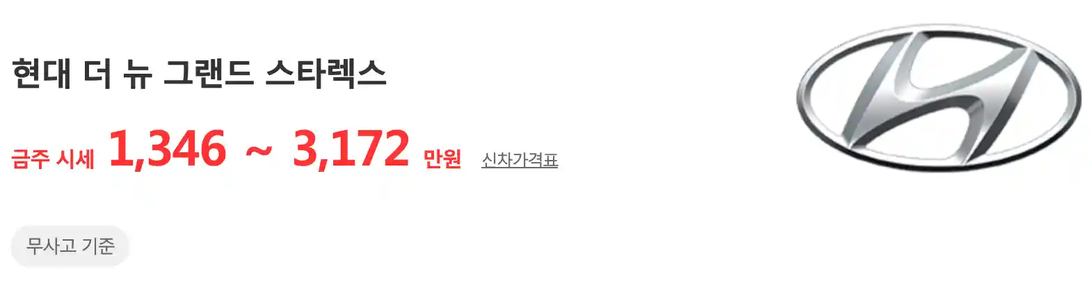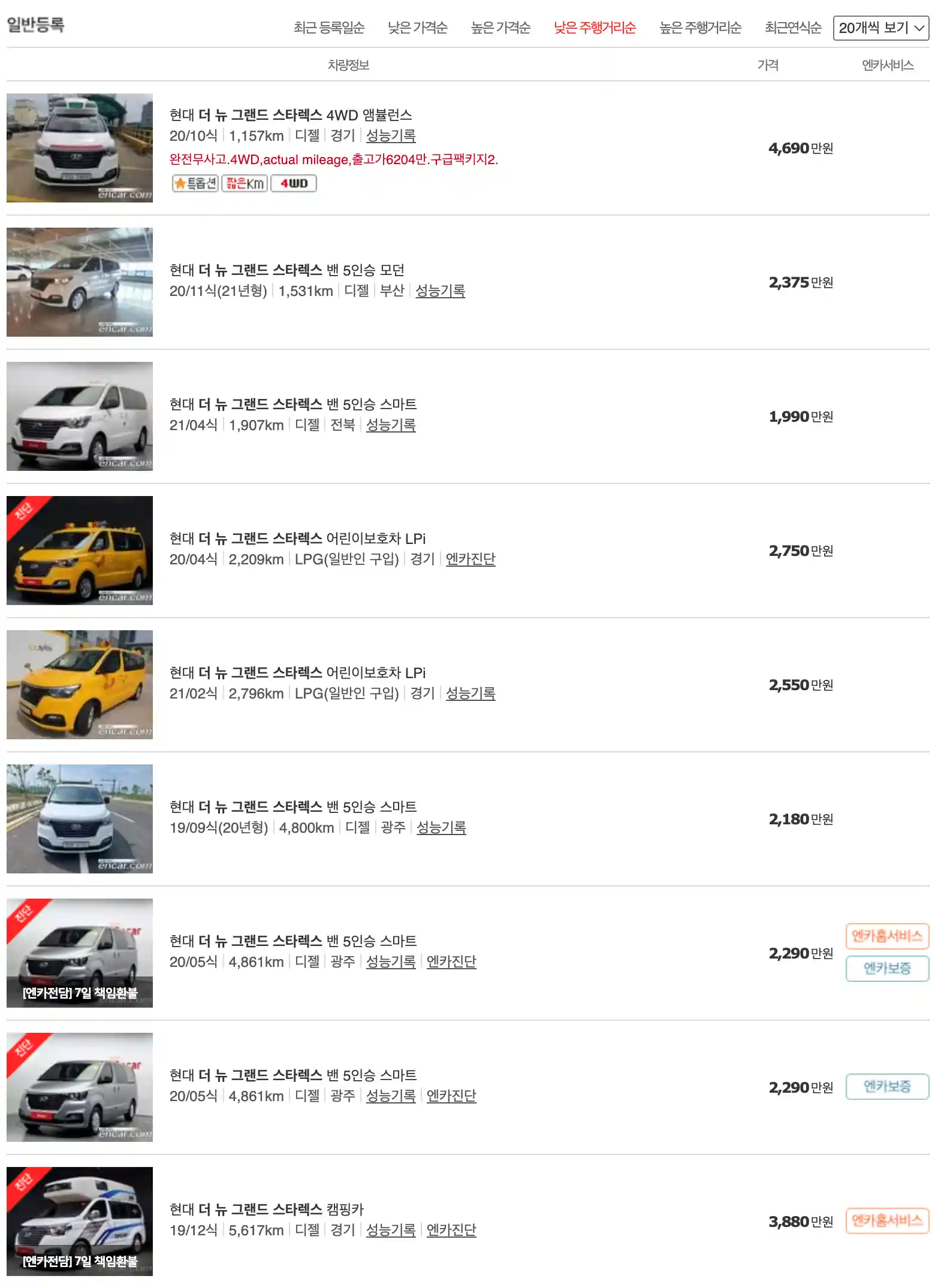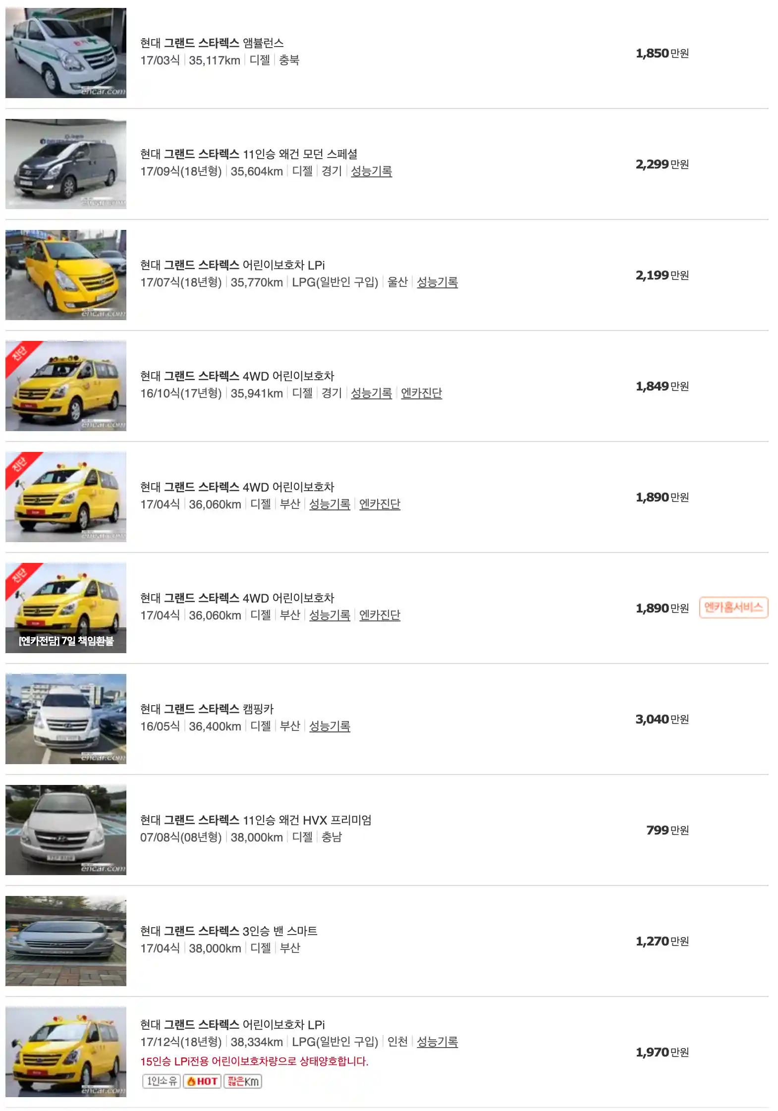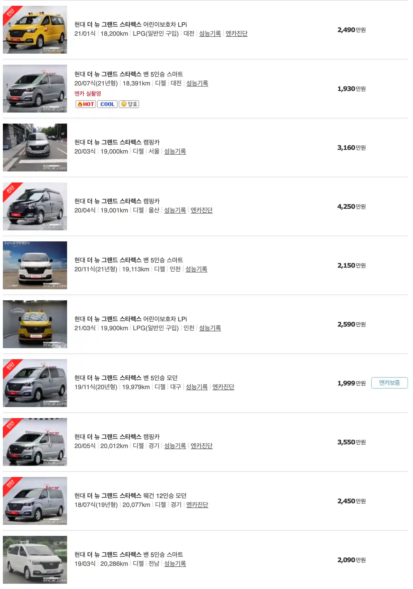스타렉스 중고차 가격을 모델별로 우대등록된 대표매물과 주행거리가 짧은 순으로 정렬했습니다. 스타렉스 신차 가격과 중고차 가격을 비교해보시고 연식, 무사고 여부, 선택 옵션 등 꼼꼼하게 확인해보시고 알아보시기 바랍니다. 인기가 많은 차종과 모델은 거래가 빠르게 이루어지기 때문에 엔카 홈페이지에 들어가셔서 실시간 거래 현황도 참고하시기 바랍니다.