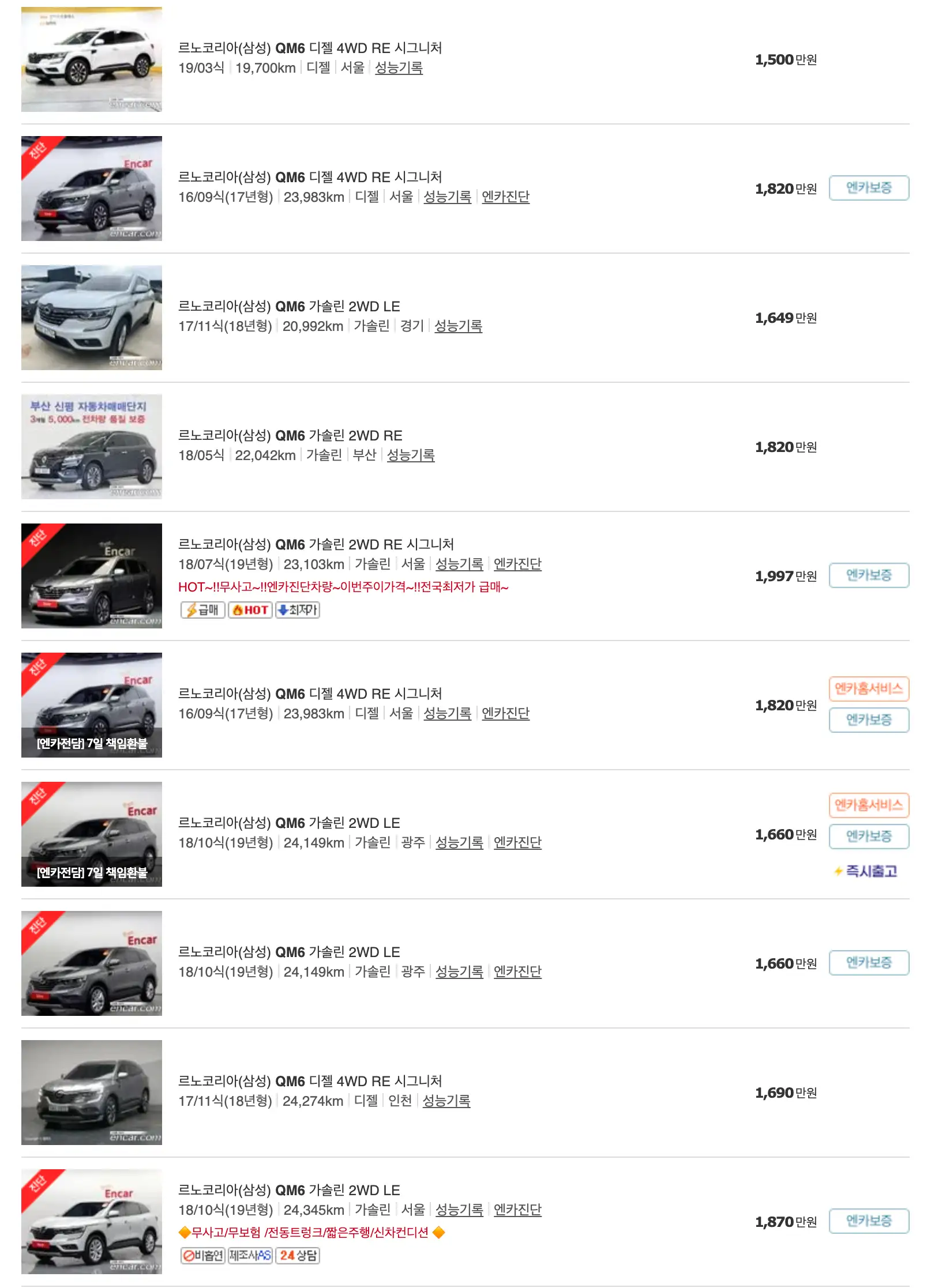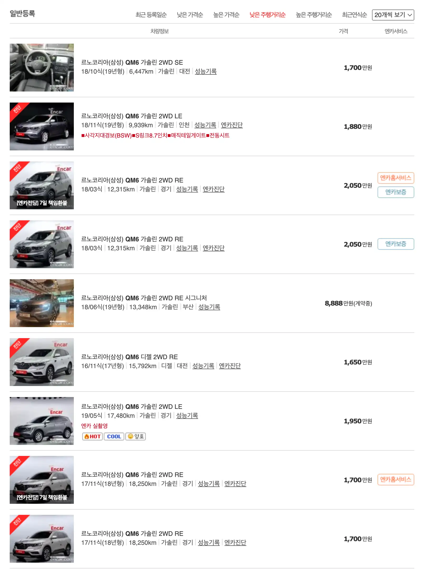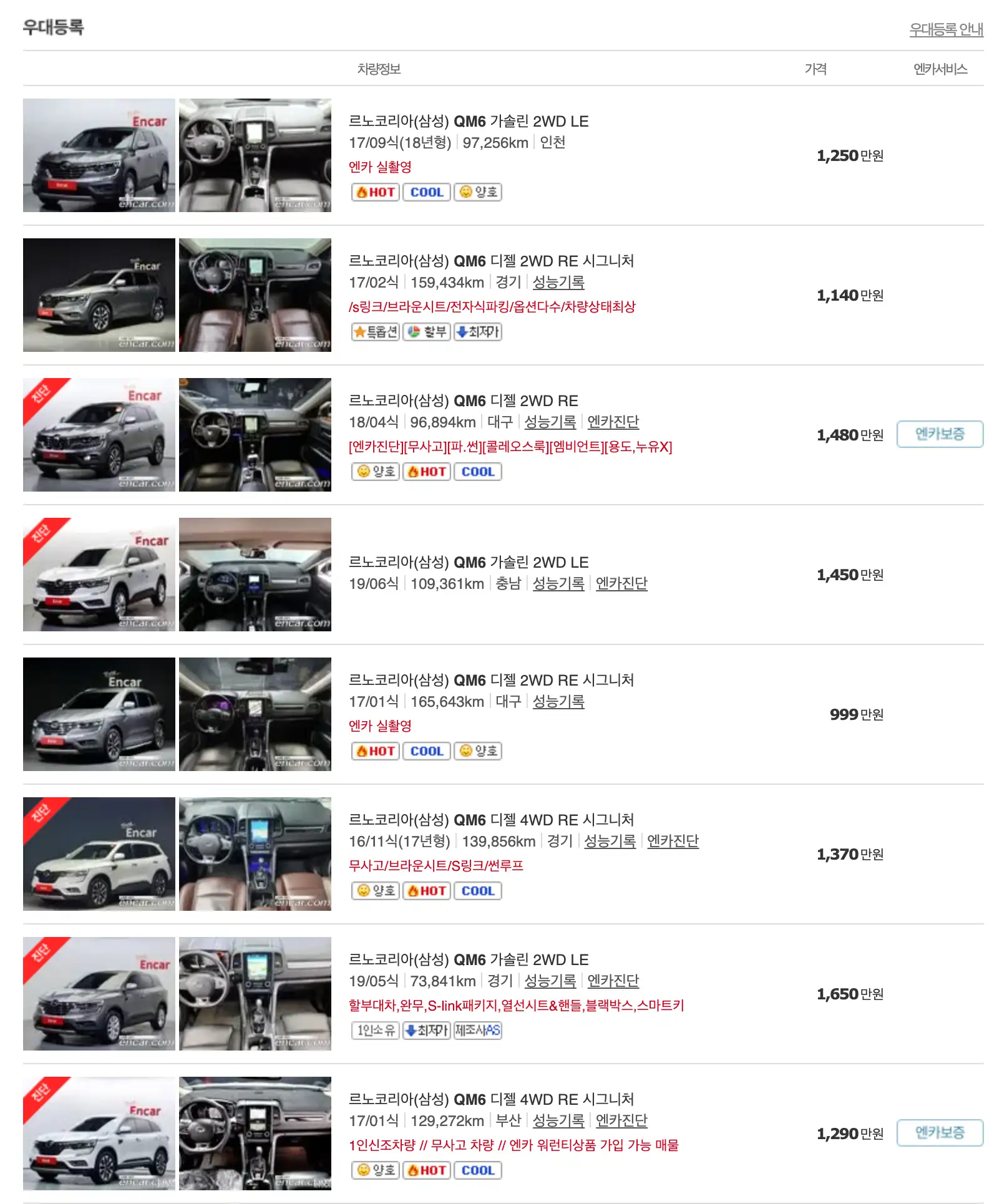 르노코리아 QM6 중고차 가격을 모델별로 우대등록된 대표매물과 주행거리가 짧은 순으로 정렬했습니다. 르노코리아 QM6 신차 가격과 중고차 가격을 비교해보시고 연식, 무사고 여부, 선택 옵션 등 꼼꼼하게 확인해보시고 알아보시기 바랍니다. 인기가 많은 차종과 모델은 거래가 빠르게 이루어지기 때문에 엔카 홈페이지에 들어가셔서 실시간 거래 현황도 참고하시기 바랍니다.