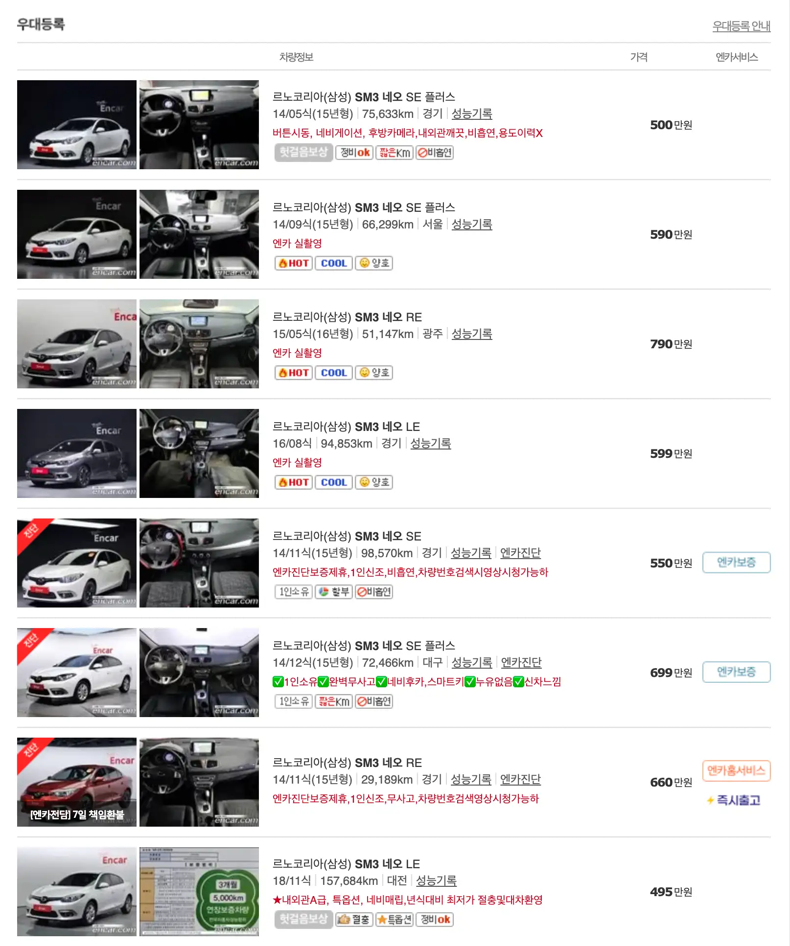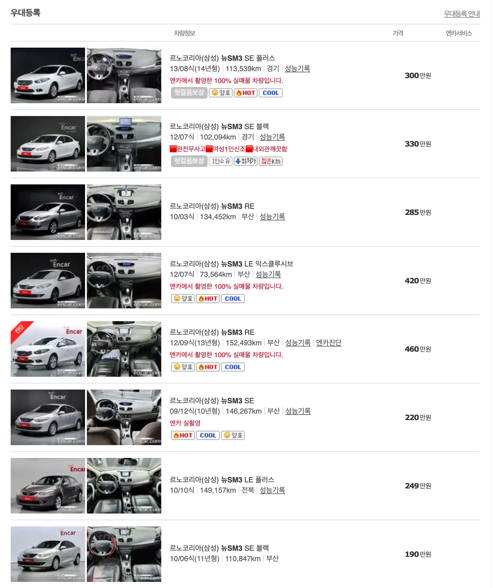 르노코리아 SM3 중고차 가격을 모델별로 우대등록된 대표매물과 주행거리가 짧은 순으로 정렬했습니다. 르노코리아 SM3 신차 가격과 중고차 가격을 비교해보시고 연식, 무사고 여부, 선택 옵션 등 꼼꼼하게 확인해보시고 알아보시기 바랍니다. 인기가 많은 차종과 모델은 거래가 빠르게 이루어지기 때문에 엔카 홈페이지에 들어가셔서 실시간 거래 현황도 참고하시기 바랍니다.