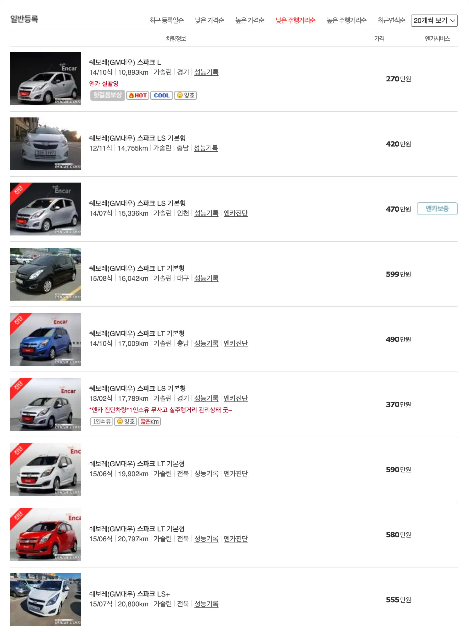 스파크 중고차 가격을 모델별로 우대등록된 대표매물과 주행거리가 짧은 순으로 정렬했습니다. 스파크 신차 가격과 중고차 가격을 비교해보시고 연식, 무사고 여부, 선택 옵션 등 꼼꼼하게 확인해보시고 알아보시기 바랍니다. 인기가 많은 차종과 모델은 거래가 빠르게 이루어지기 때문에 엔카 홈페이지에 들어가셔서 실시간 거래 현황도 참고하시기 바랍니다.
