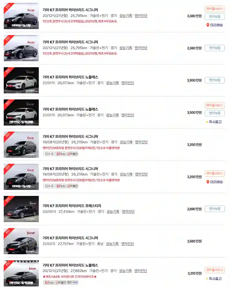 K7 프리미어 하이브리드 (19~21년) : 2,515 ~ 3,525 만 원