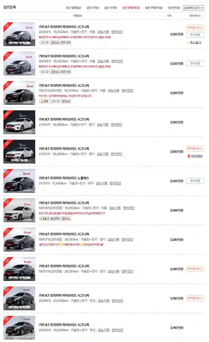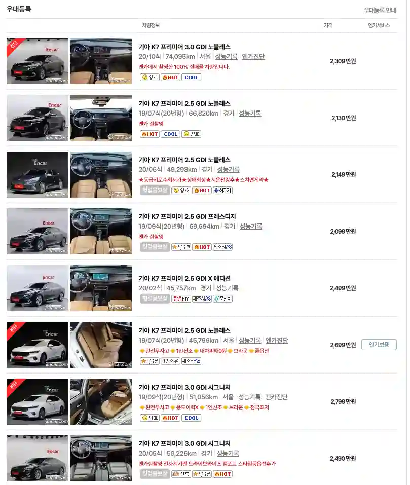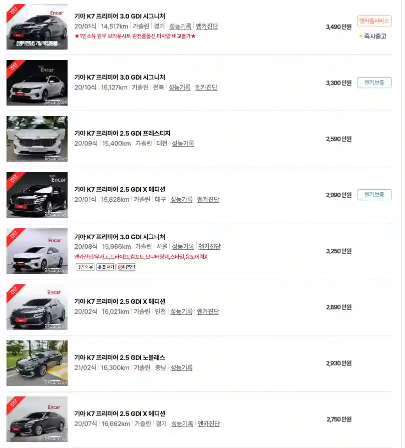 기아 K7 중고차 가격을 모델별로 우대등록된 대표매물과 주행거리가 짧은 순으로 정렬했습니다. 기아 K7 신차 가격과 중고차 가격을 비교해보시고 연식, 무사고 여부, 선택 옵션 등 꼼꼼하게 확인해보시고 알아보시기 바랍니다. 인기가 많은 차종과 모델은 거래가 빠르게 이루어지기 때문에 엔카 홈페이지에 들어가셔서 실시간 거래 현황도 참고하시기 바랍니다.