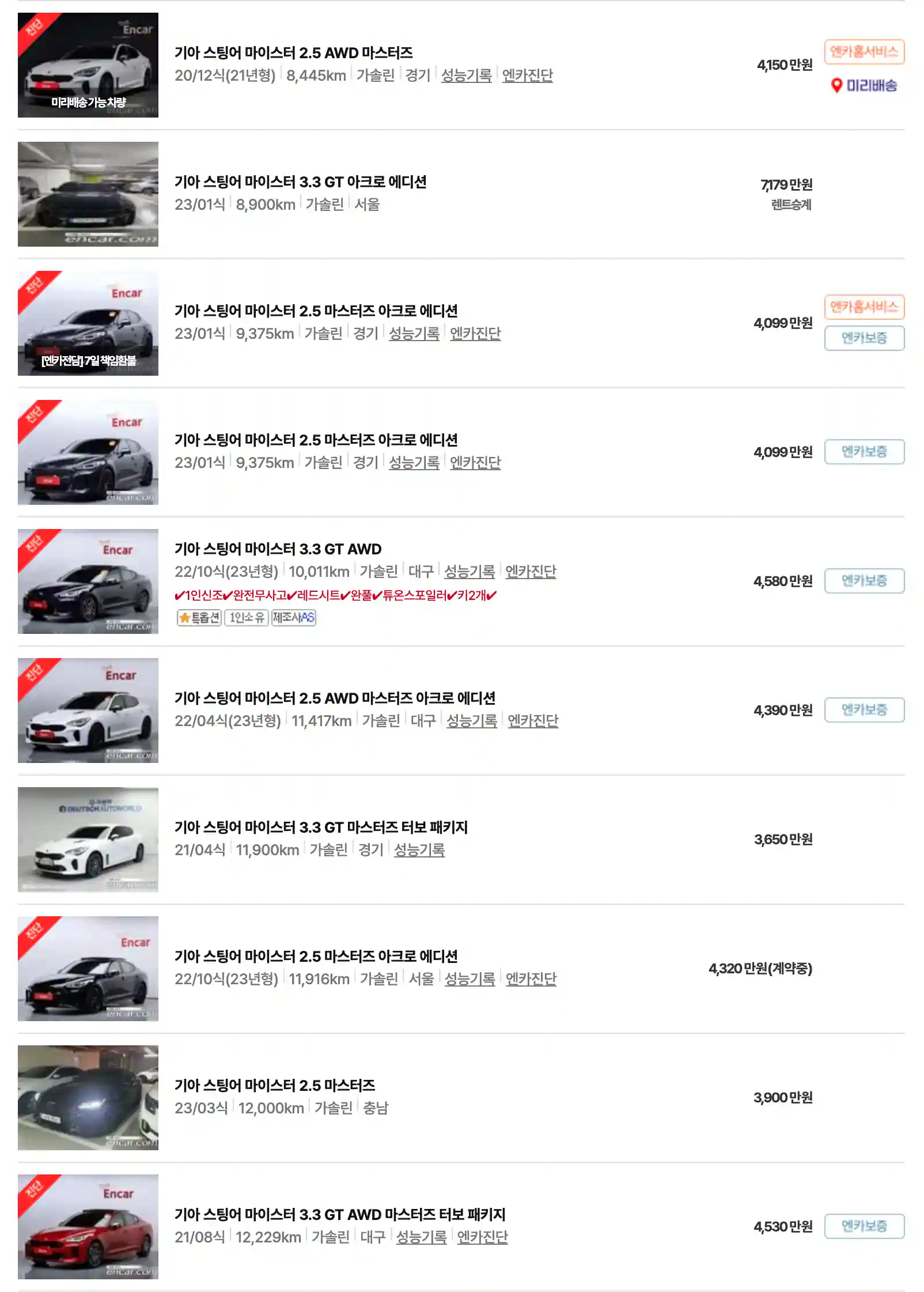 2023년 10월 엔카 플랫폼 기아 스팅어 모델별 중고차 시세표입니다. 기아 스팅어 중고차 구입을 고려하고 계시다면 모델별 시세표를 참고하시고 원하시는 예산 금액에 좋은 매물을 구입하시기를 바랍니다.