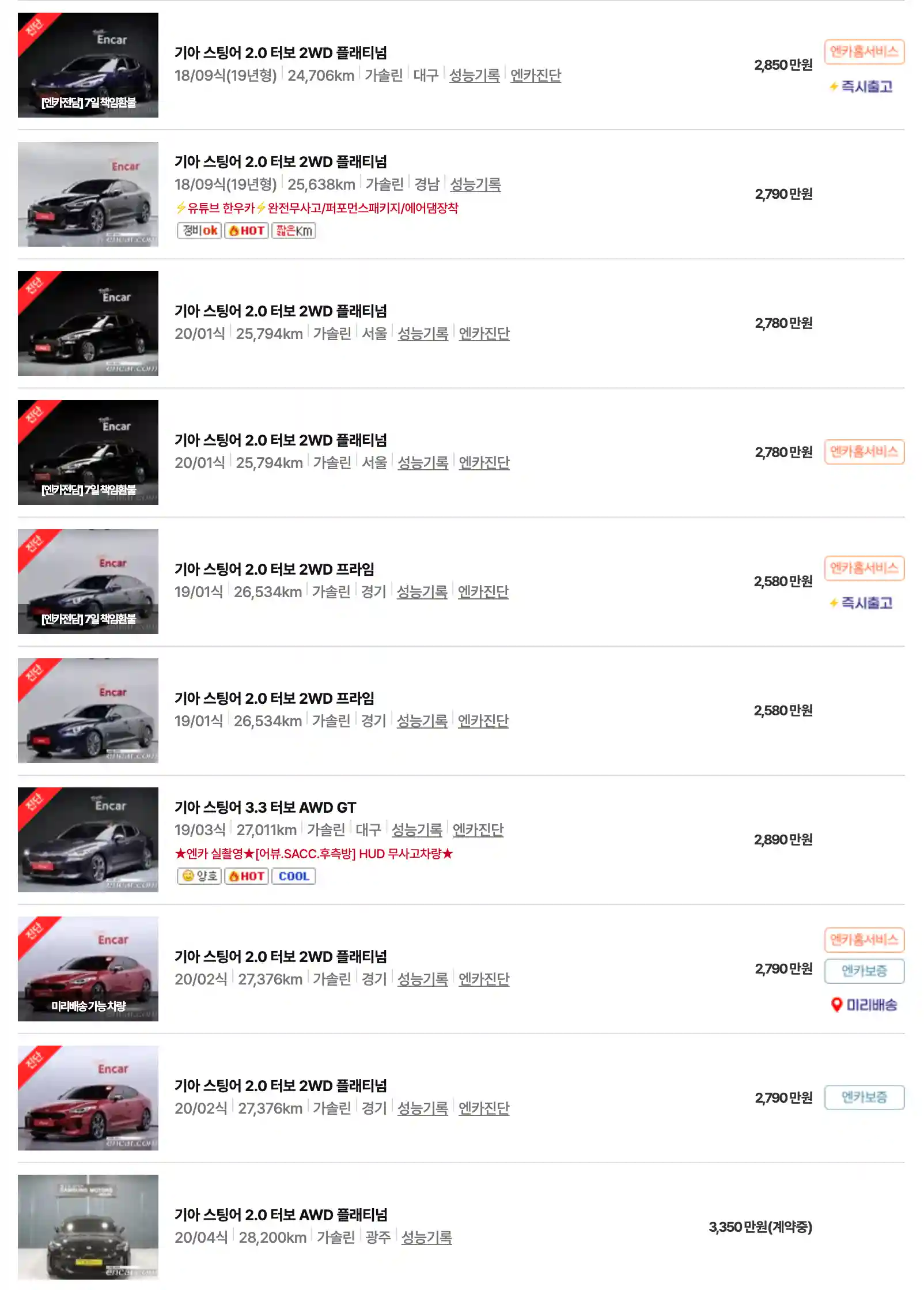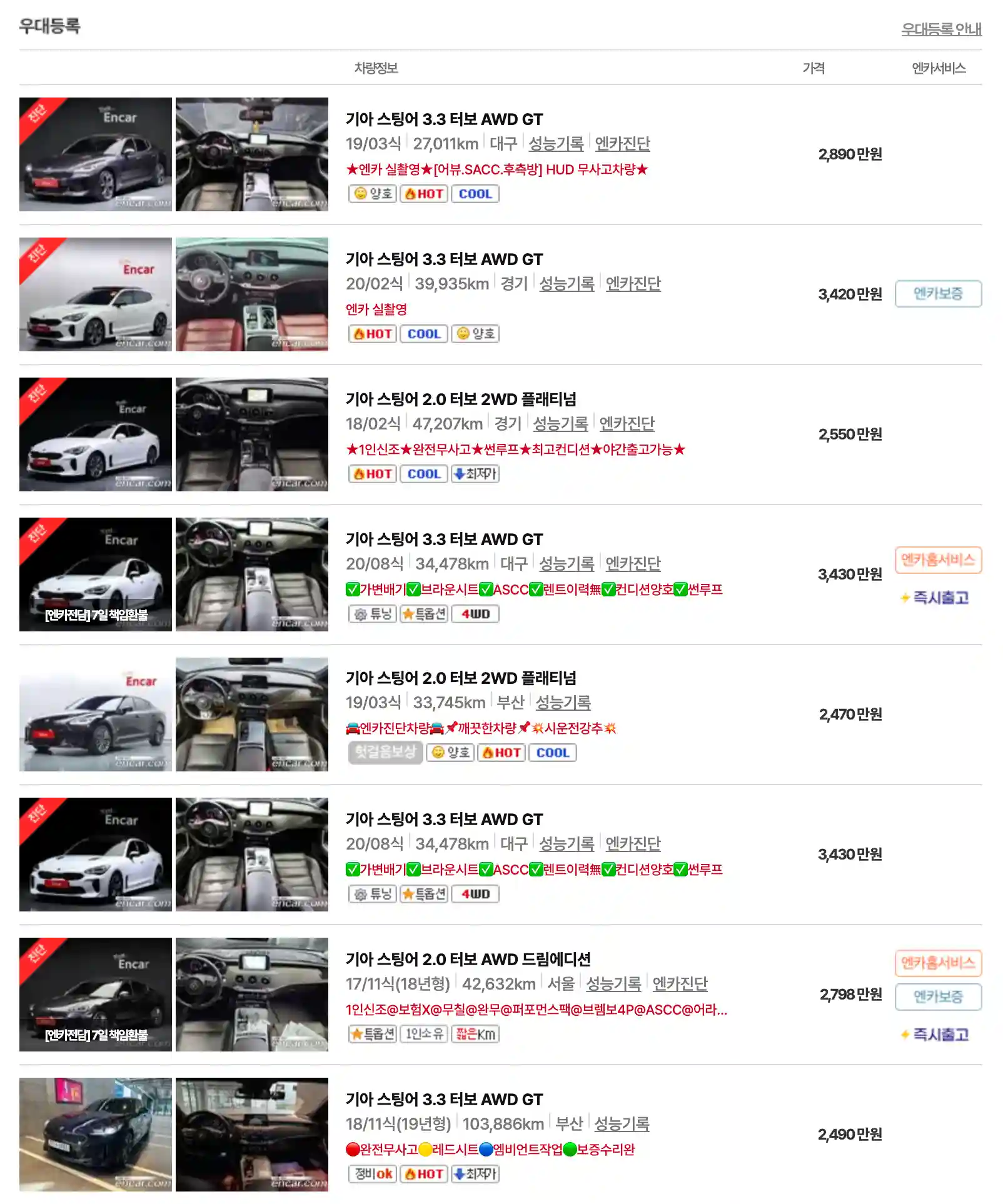 차를 선택할 때는 엔진과 트림, 그리고 연식과 주행 거리를 고려해야 합니다. 기아 스팅어 중고차는 뛰어난 성능과 디자인을 가진 스포츠 세단으로, 합리적인 가격대에서 구매할 수 있는 중고차로서 고려할 만한 가치가 있습니다.