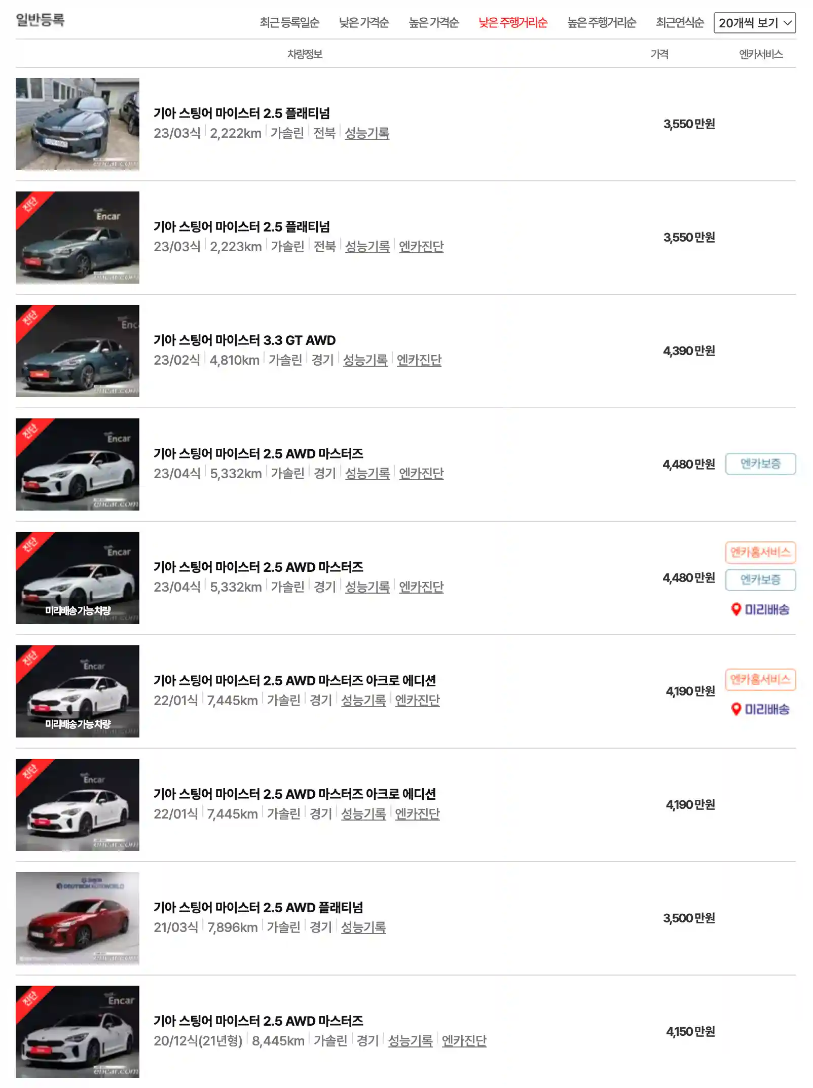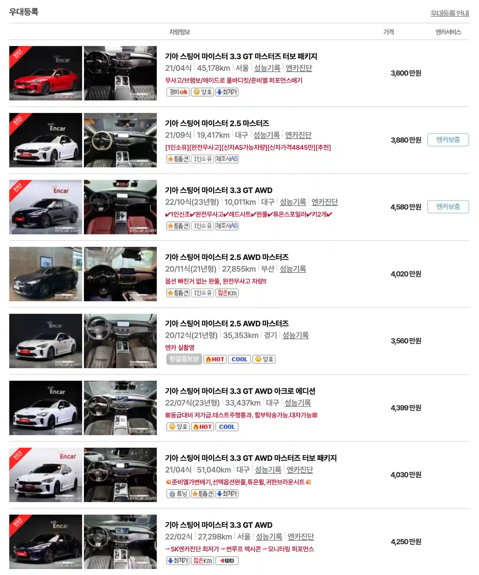 기아 스팅어 중고차 가격을 모델별로 우대등록된 대표매물과 주행거리가 짧은 순으로 정렬했습니다. 기아 스팅어 신차 가격과 중고차 가격을 비교해보시고 연식, 무사고 여부, 선택 옵션 등 꼼꼼하게 확인해보시고 알아보시기 바랍니다. 인기가 많은 차종과 모델은 거래가 빠르게 이루어지기 때문에 엔카 홈페이지에 들어가셔서 실시간 거래 현황도 참고하시기 바랍니다.