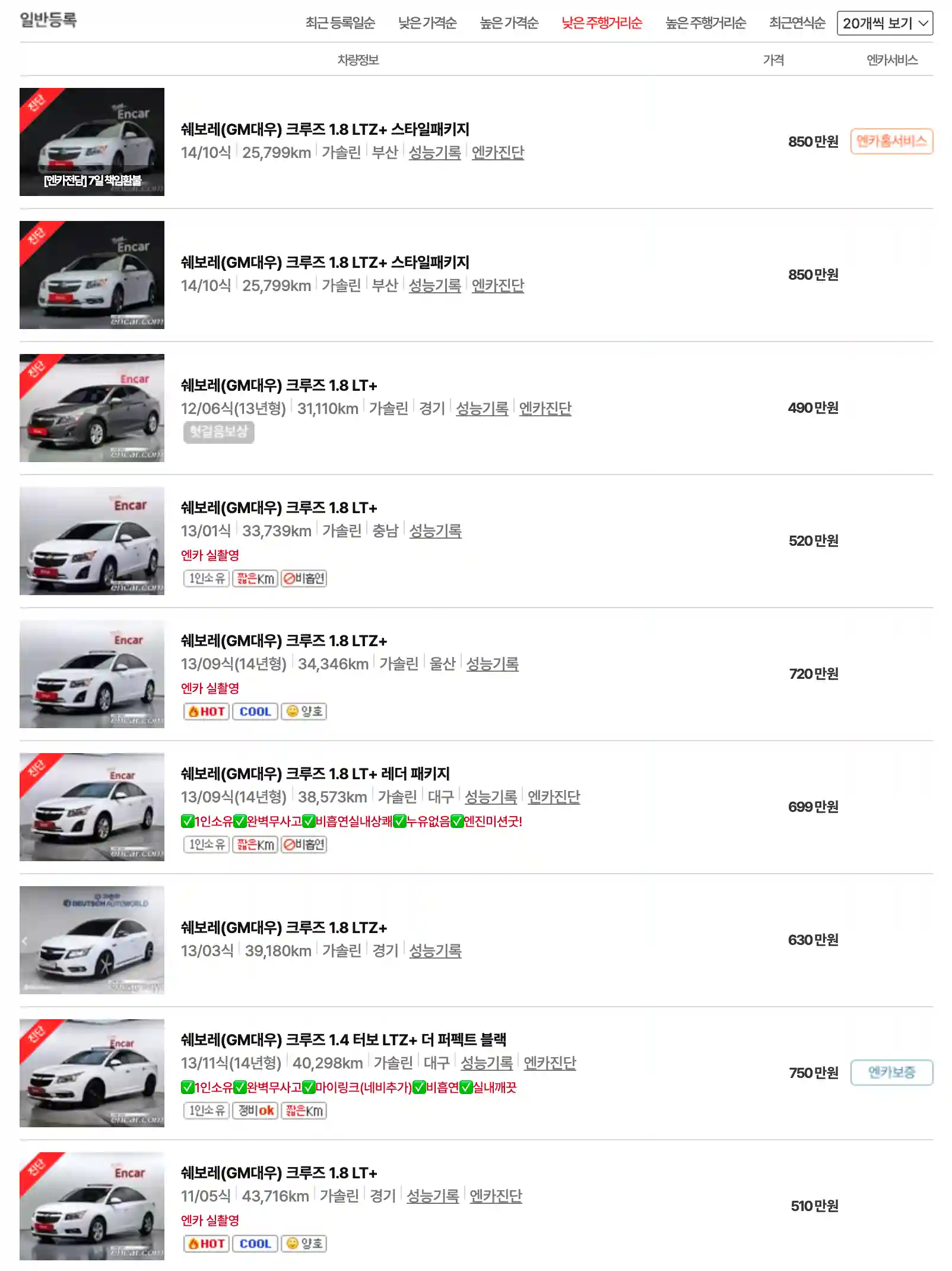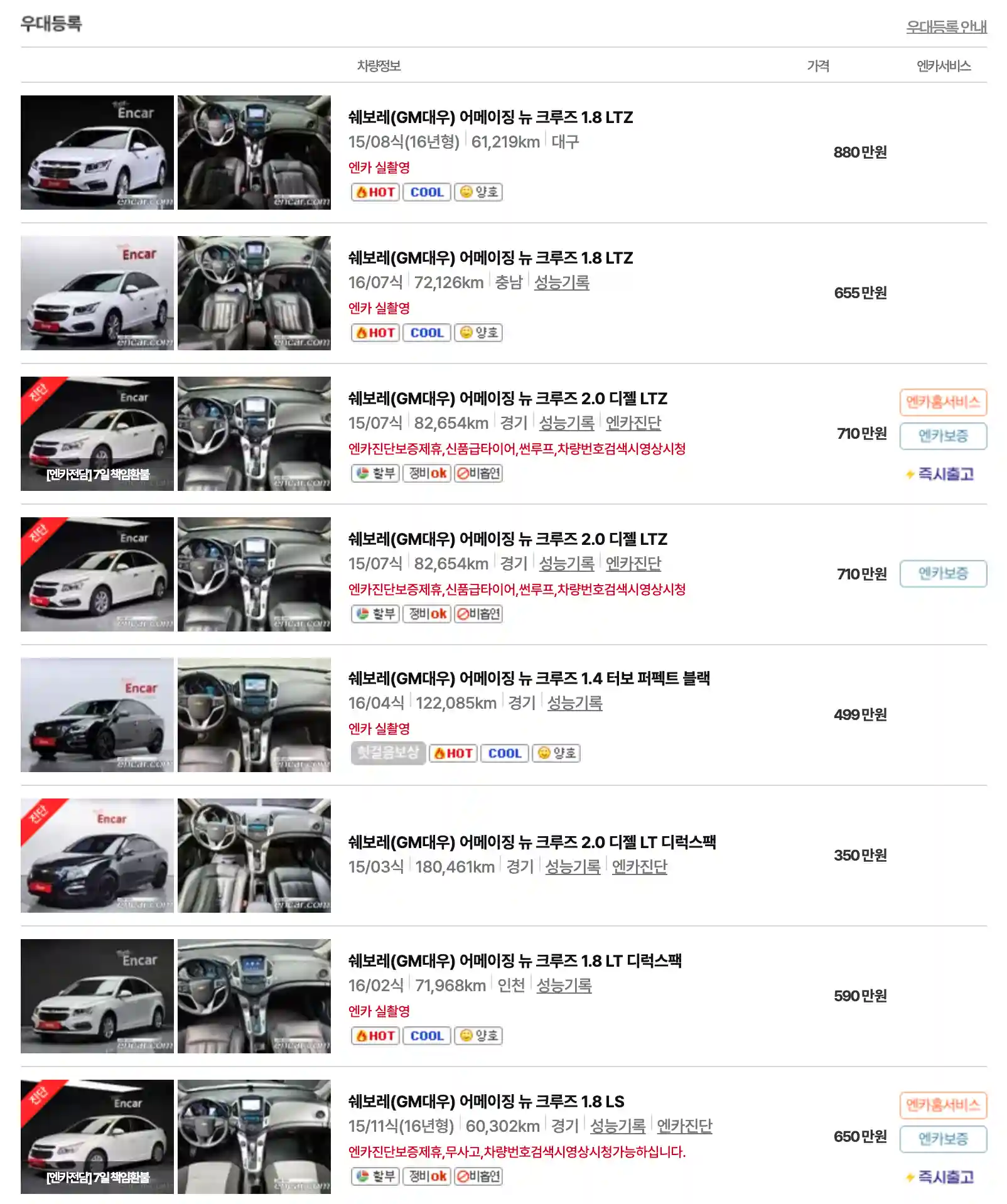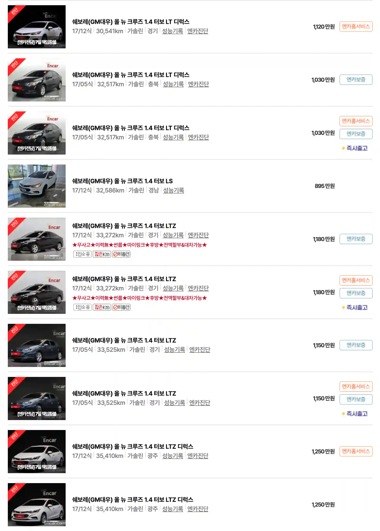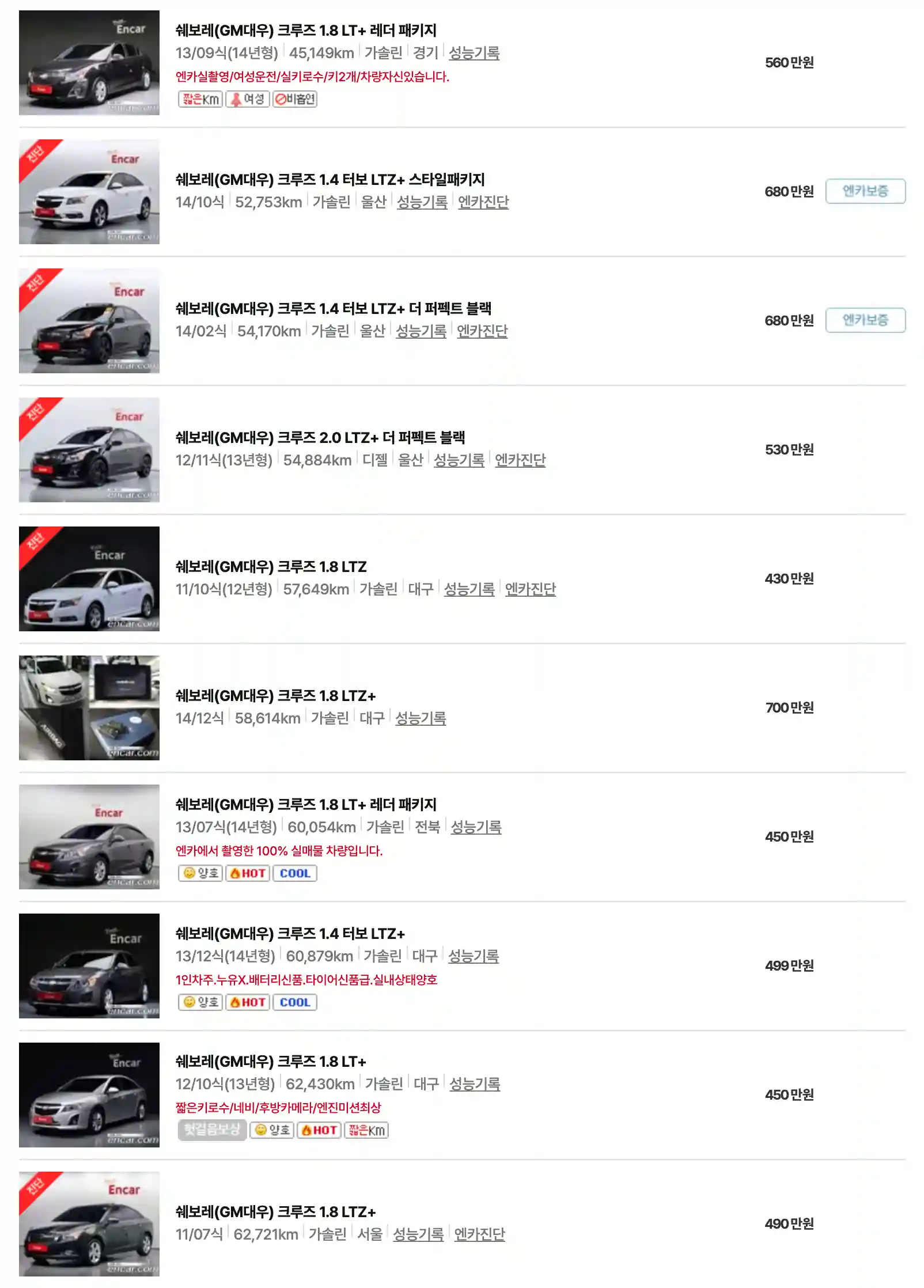쉐보레 크루즈 중고차 가격을 모델별로 우대등록된 대표매물과 주행거리가 짧은 순으로 정렬했습니다. 쉐보레 크루즈 신차 가격과 중고차 가격을 비교해보시고 연식, 무사고 여부, 선택 옵션 등 꼼꼼하게 확인해보시고 알아보시기 바랍니다. 인기가 많은 차종과 모델은 거래가 빠르게 이루어지기 때문에 엔카 홈페이지에 들어가셔서 실시간 거래 현황도 참고하시기 바랍니다.