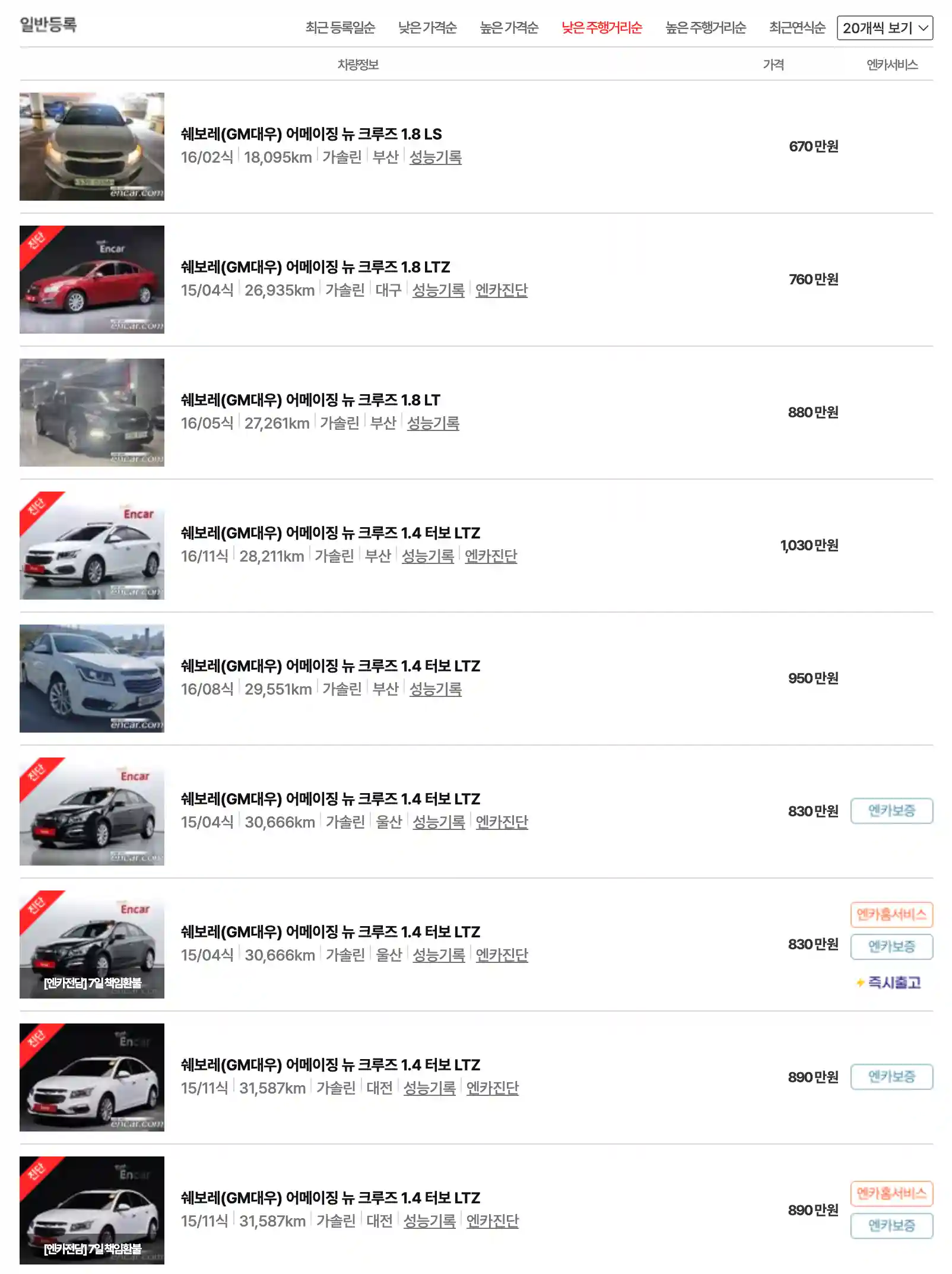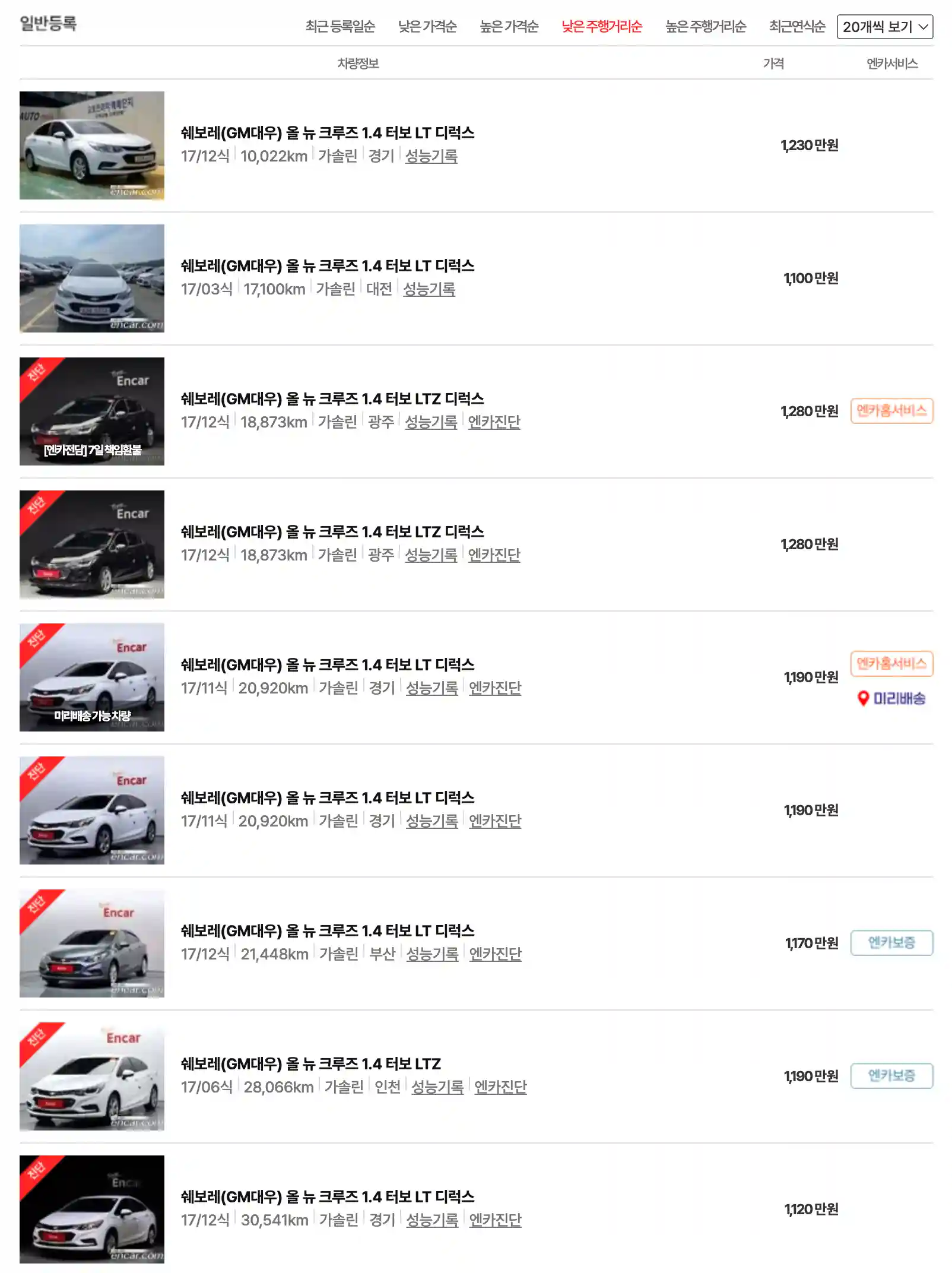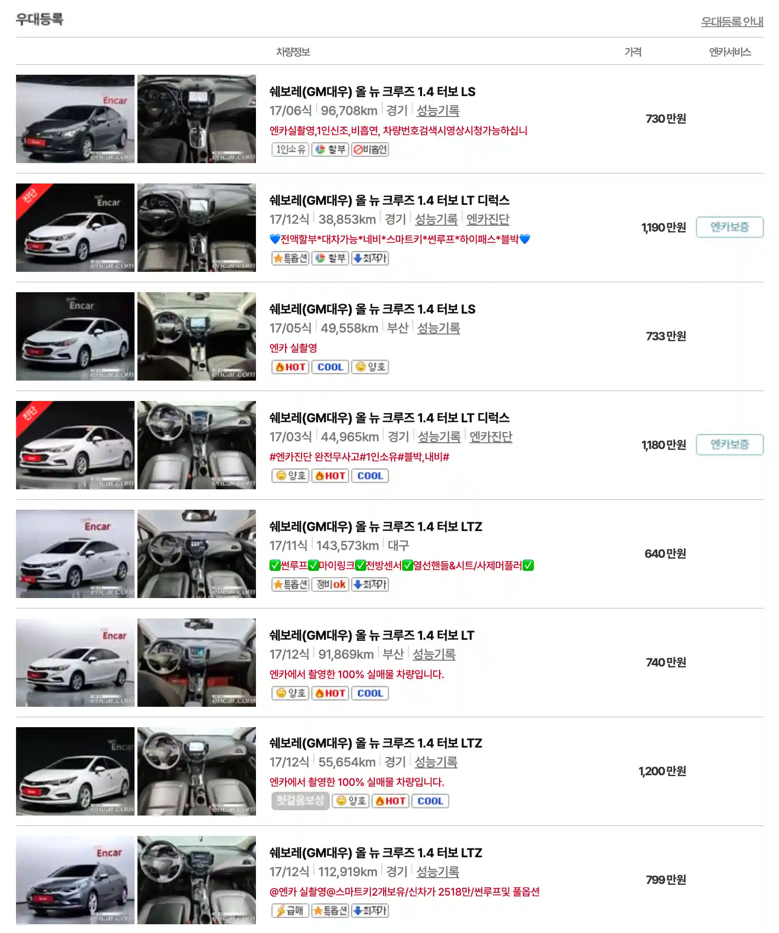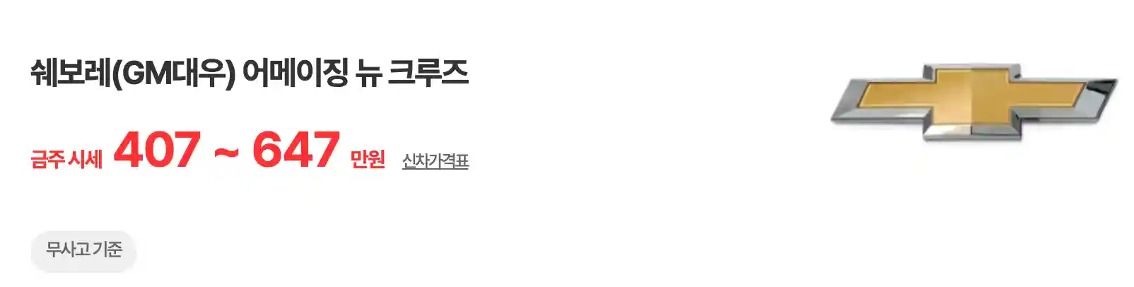 쉐보레 크루즈 중고차 가격을 모델별로 우대등록된 대표매물과 주행거리가 짧은 순으로 정렬했습니다. 쉐보레 크루즈 신차 가격과 중고차 가격을 비교해보시고 연식, 무사고 여부, 선택 옵션 등 꼼꼼하게 확인해보시고 알아보시기 바랍니다. 인기가 많은 차종과 모델은 거래가 빠르게 이루어지기 때문에 엔카 홈페이지에 들어가셔서 실시간 거래 현황도 참고하시기 바랍니다.