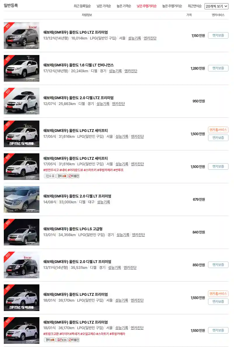 쉐보레 올란도 중고차 가격을 모델별로 우대등록된 대표매물과 주행거리가 짧은 순으로 정렬했습니다. 쉐보레 올란도 신차 가격과 중고차 가격을 비교해보시고 연식, 무사고 여부, 선택 옵션 등 꼼꼼하게 확인해보시고 알아보시기 바랍니다. 인기가 많은 차종과 모델은 거래가 빠르게 이루어지기 때문에 엔카 홈페이지에 들어가셔서 실시간 거래 현황도 참고하시기 바랍니다.